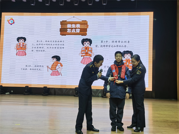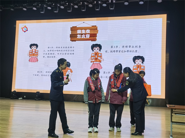 在互动环节中,海事局团委负责人王硕磊先生详细介绍了各种常见的水上安全标志和安全设备的功能及使用方法,特别强调了如何正确穿戴救生衣。针对意外落水时应采取的措施,闻婧女士向学生们传授了保持冷静、正确呼吸和发出求救信号等技巧;而面对船上火灾的情况,则强调了迅速撤离、寻找逃生通道以及利用灭火器扑灭初期火源的方法。