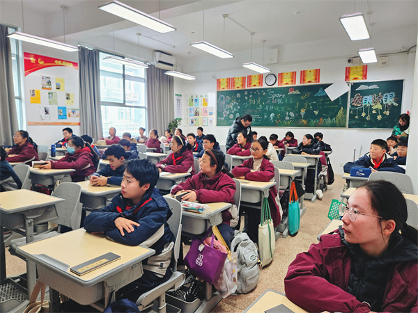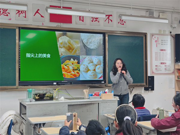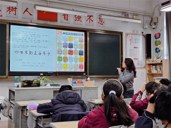 在饱餐一顿后,初一7班的学生们回到班级,地理组肖翠翠老师给同学们带来了一场拓宽视野的讲座《中华美食之旅》,共同感受舌尖上的中国。肖老师先是介绍了中国农业的发展,重点着眼于基础粮食的发展演变过程的介绍,同学们表示第一次对于每日吃的五谷杂粮有着如此清晰的追根朔源。紧接着,肖老师给同学们带来了五谷杂粮的种子与成品标本,通过让学生亲手感知触摸,近距离感受粮食的源来。最后,结合初中阶段地理气候知识,肖老师讲解了五谷杂粮地理分布情况,“一方水土养一方人”,让学生深刻感知到粮食的多方用途。值得一提的是,课程中还引入到“粮食作物未来发展”的话题,学生对此产生了深刻的讨论,使得整场活动进入一定的理论高度。