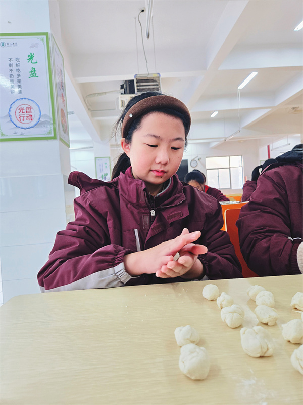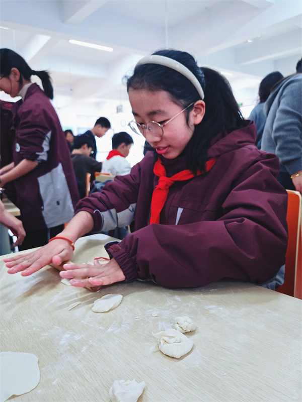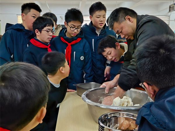 活动当天,食堂内秩序井然,初一7班的学生们按照既定安排,分组进行各项准备工作。在专业厨师的指导下,大家从面团擀制、馅料调制到饺子包制,每一步都认真对待,力求完美。活动过程中,师生们展现了高度的团队协作精神和创新思维,不仅制作了传统的饺子形状,还尝试了各种创意造型,使得整个活动充满了趣味性和挑战性。