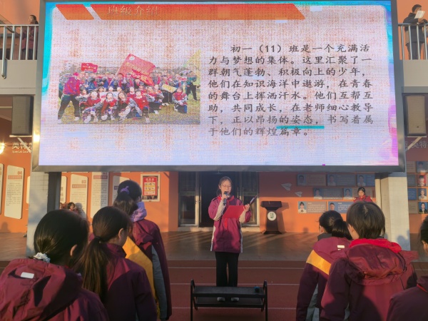 本周的升旗仪式由初一(11)班主要负责,主持人是仇以然同学,升旗手是郑舜瑀同学,护旗手是李昀儿同学和陈玥涵同学。当主持人宣布升旗仪式正式开始时,初一(11)班国旗队的三位同学迈着统一的步伐,在庄严的音乐中昂首向前,伴着国歌,五星红旗在空中缓缓升起,在初升的太阳中迎风飘扬。