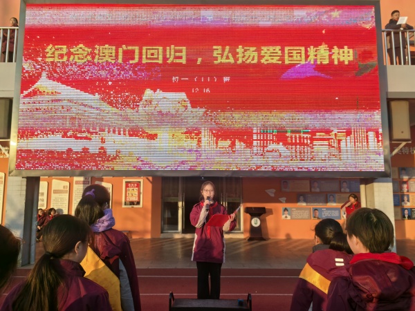 升旗仪式过后,同学们庄严肃立,所有年级都以饱满的精神颂唱国歌,表达对祖国的热爱。紧接着,主持人宣布演讲开始,初一(11)班的周然然演讲人上台演讲,她演讲的主题是“纪念澳门回归,弘扬爱国精神”,仇以然同学先介绍了澳门回归过程,并强调澳门回归的历程,是一部波澜壮阔的爱国史诗,获得同学们热烈掌声。