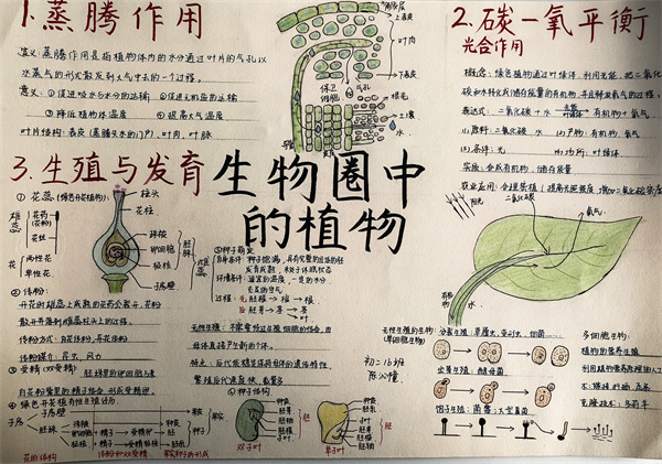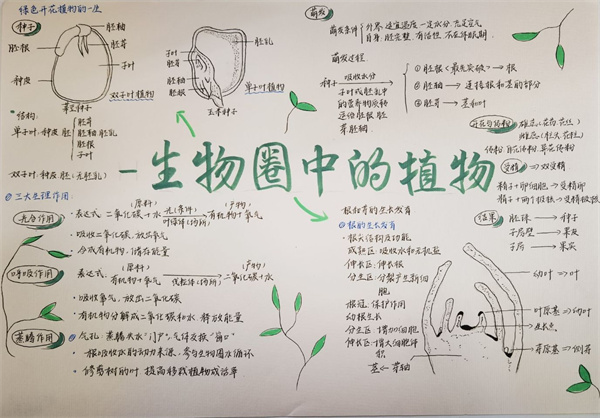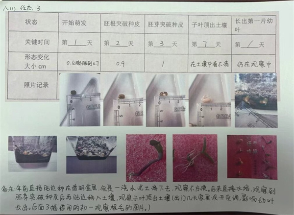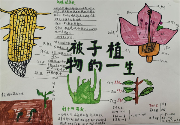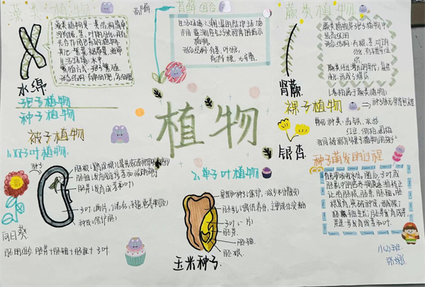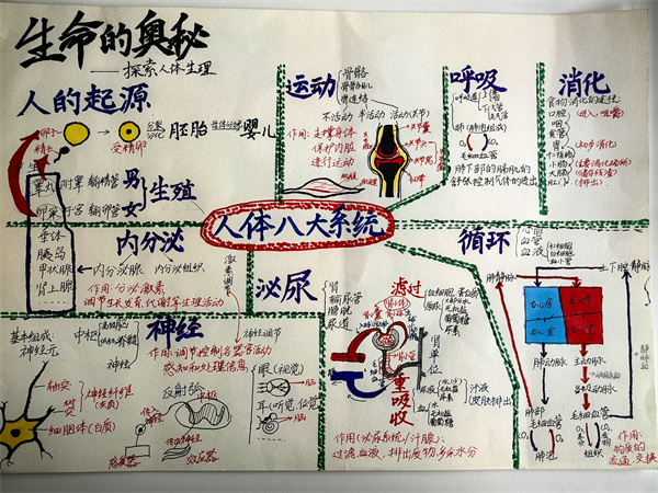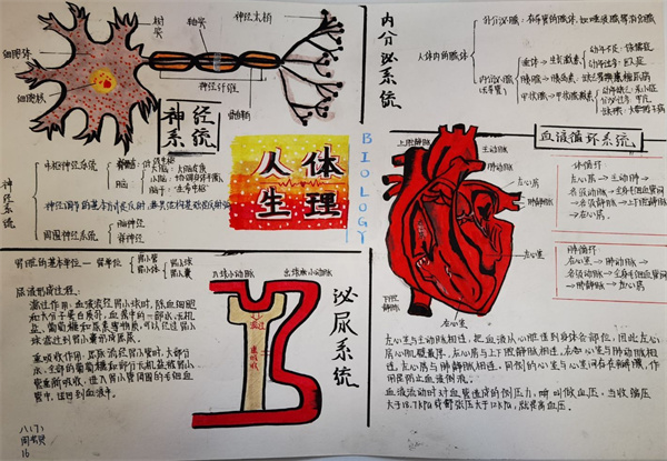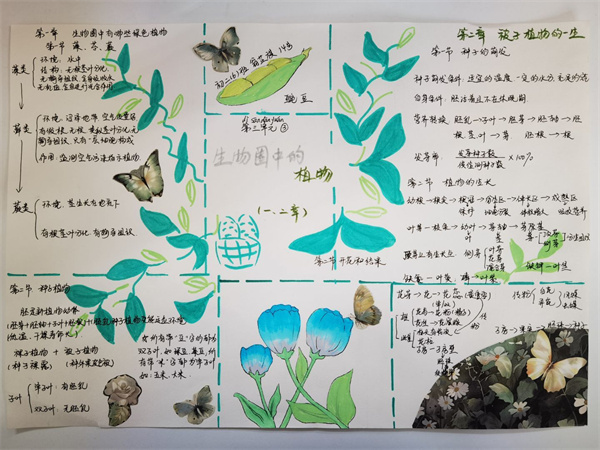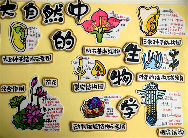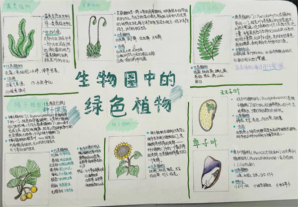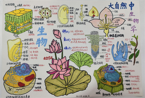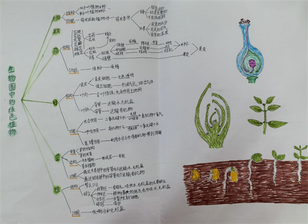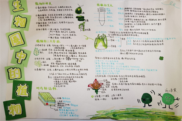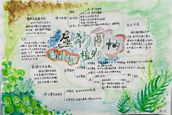 初二年级聚焦"生命成长观察",设置种子萌发实验与思维导图绘制两大任务。前者通过透明容器实时记录种子破土而出的全过程,后者以手绘方式系统梳理生物生理知识体系。在探究种子萌发作业中,同学们精心种植,每日观察并记录种子萌发不同阶段的状态,并用文字和图片记录生命成长的轨迹。在绘制思维导图作业中,学生们对学过的知识进行归纳梳理,探寻知识点之间的联系,主题鲜明突出,图文并茂,巧妙整合构建生物学科中的知识体系,提高了学生自主分析归纳能力,还极大的帮助同学们备战生物会考。