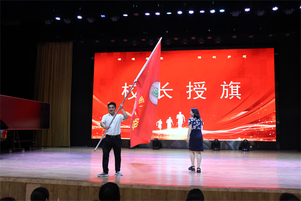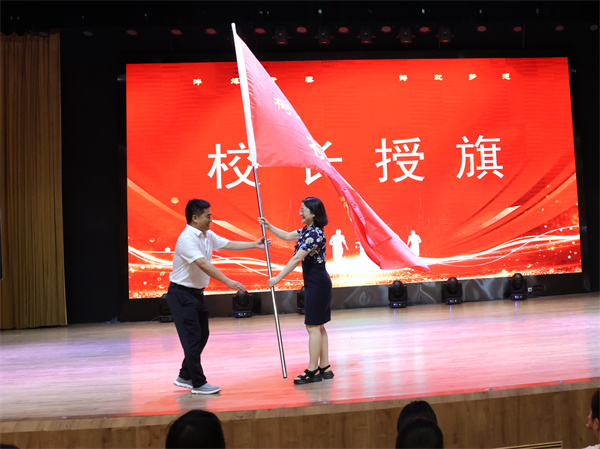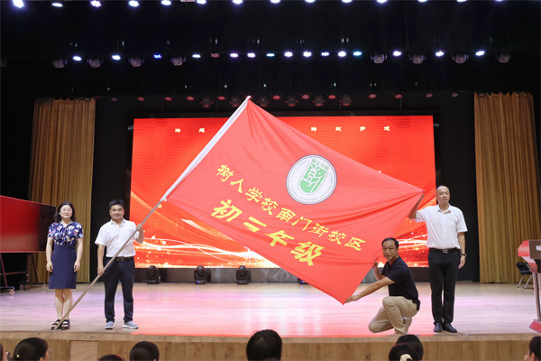 在热烈的掌声中,南门街校区校长姜亚芹手持鲜红的年级大旗,郑重地将旗帜交到年级管委会老师手中。这面旗帜象征着责任与使命,更承载着学校对同学们的期望。这一刻,每一位初三学子都感受到了使命在肩,也更加明确了自己的奋斗方向。