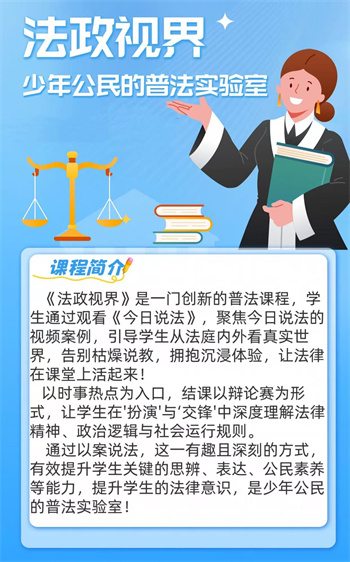 《法政视界》是一门面向初一学生开设的校本选修课程,旨在通过“以案说法”“时政眺望”“活动集锦”三个模块,引导学生关注法律与政治现实,提升法治素养和政治敏感力。课程注重案例教学与实践活动相结合,培养学生分析、表达、协作等多方面能力。