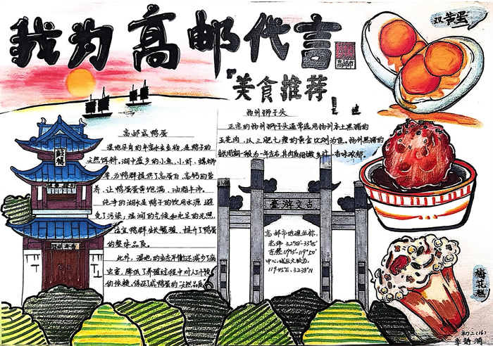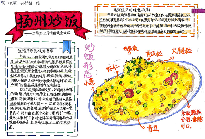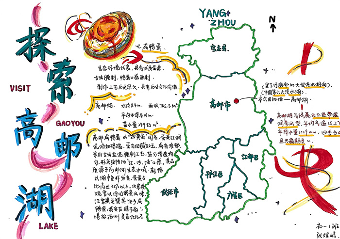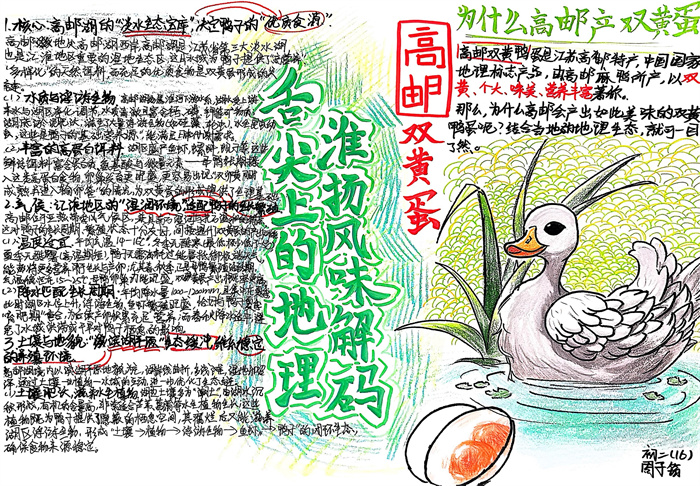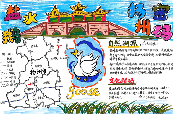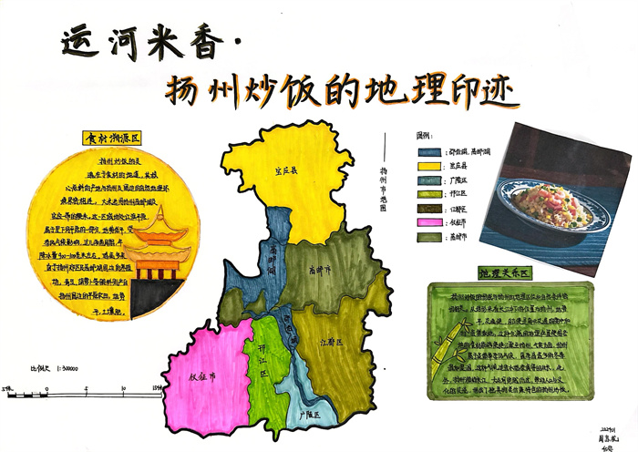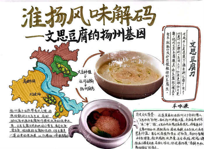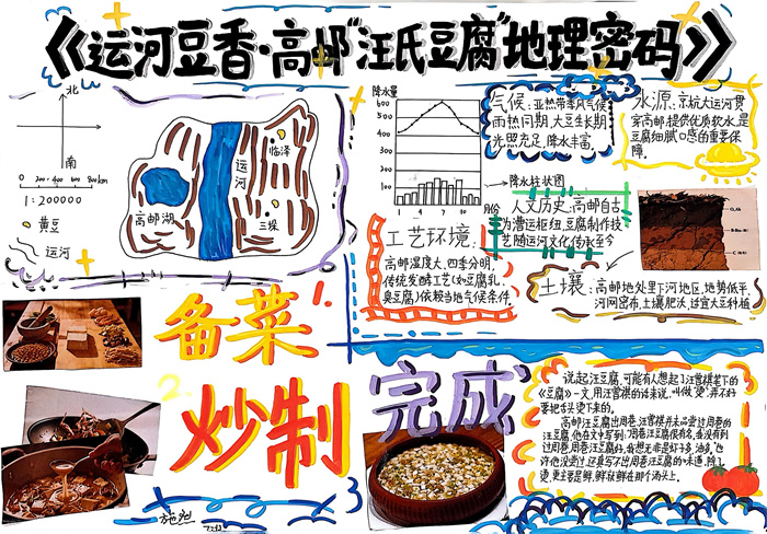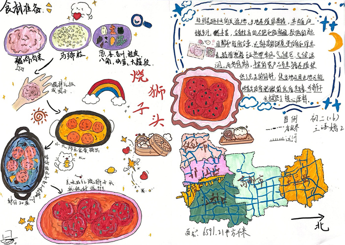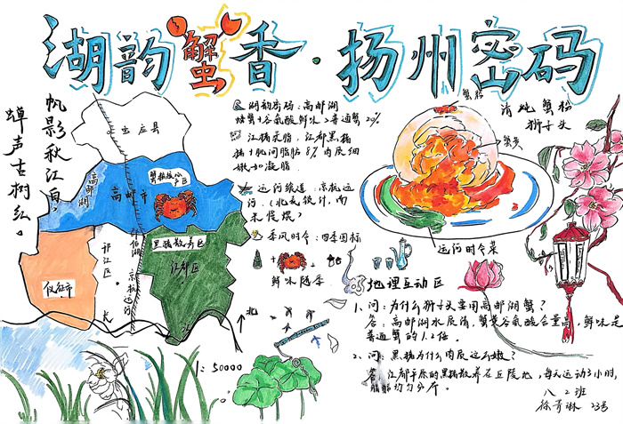 暑期,同学们围绕 “淮扬风味与地理环境” 主题积极创作,参与热情高涨。从查阅淮扬菜食材的产地分布,到分析气候、土壤对食材生长的影响,再到梳理美食背后的地域文化故事,大家充分发挥想象力与动手能力,制作出一幅幅精美的手抄报。有的作品以扬州炒饭为切入点,用色彩标注出大米、火腿、青豆等食材的来源地,清晰呈现地理环境与食材选择的关联;有的则聚焦蟹黄汤包,通过手绘地图展现扬州湖泊分布与螃蟹养殖的关系,字里行间满是对家乡水乡风貌的自豪。