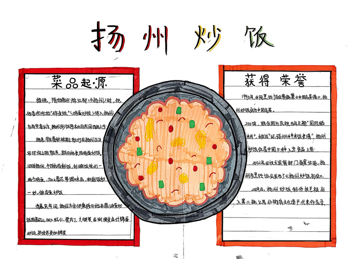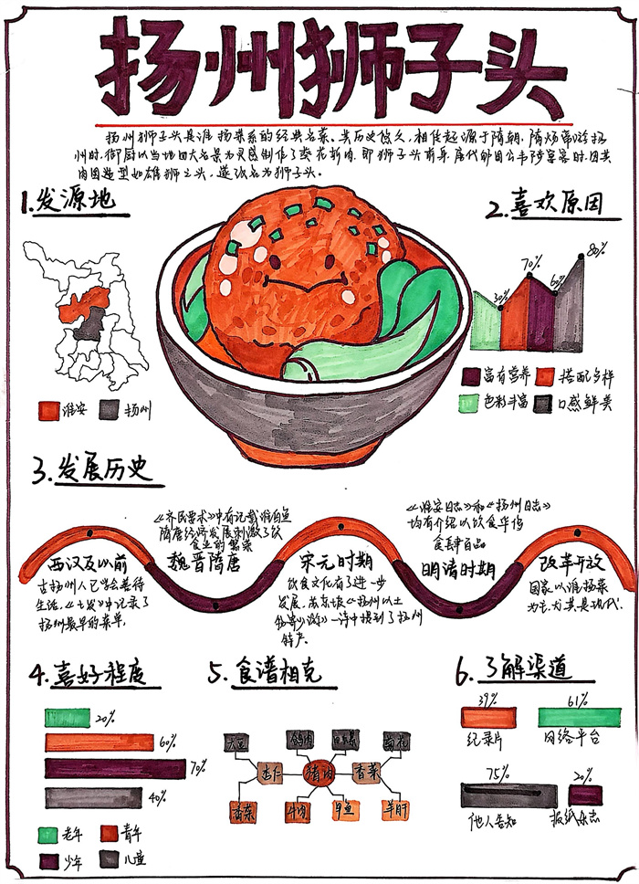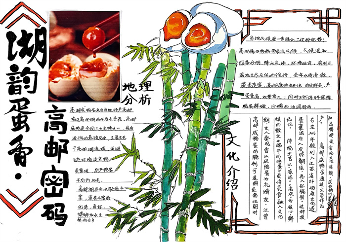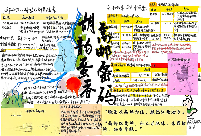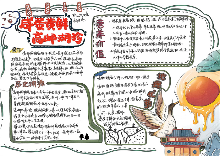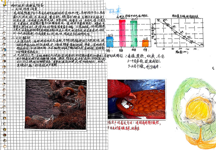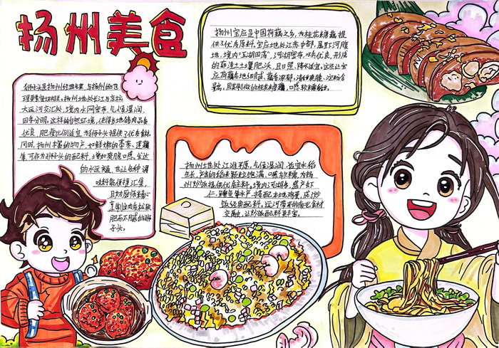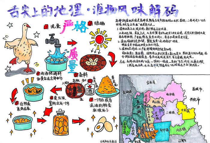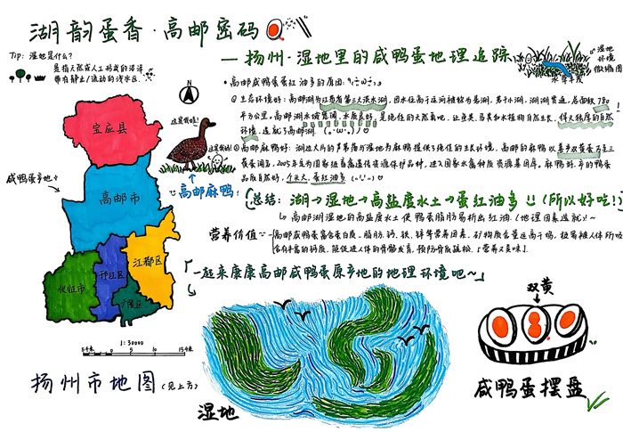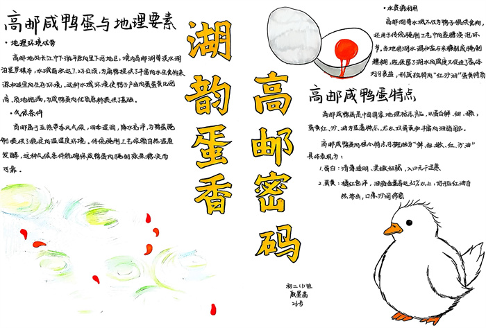 暑期,同学们围绕 “淮扬风味与地理环境” 主题积极创作,参与热情高涨。从查阅淮扬菜食材的产地分布,到分析气候、土壤对食材生长的影响,再到梳理美食背后的地域文化故事,大家充分发挥想象力与动手能力,制作出一幅幅精美的手抄报。有的作品以扬州炒饭为切入点,用色彩标注出大米、火腿、青豆等食材的来源地,清晰呈现地理环境与食材选择的关联;有的则聚焦蟹黄汤包,通过手绘地图展现扬州湖泊分布与螃蟹养殖的关系,字里行间满是对家乡水乡风貌的自豪。