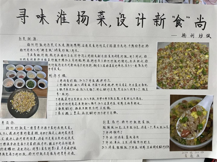 准备:【美食寻访】探访扬州有代表性的餐馆、小吃店、菜市场或家庭厨房,了解1-2道经典淮扬菜(如狮子头、大煮干丝、文思豆腐、扬州炒饭、三丁包等)的选材特点、制作过程关键步骤(不要求实操复杂烹饪)、历史渊源或趣闻轶事。拍照记录食材、制作场景或成品。