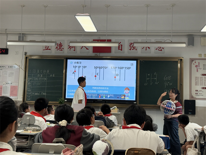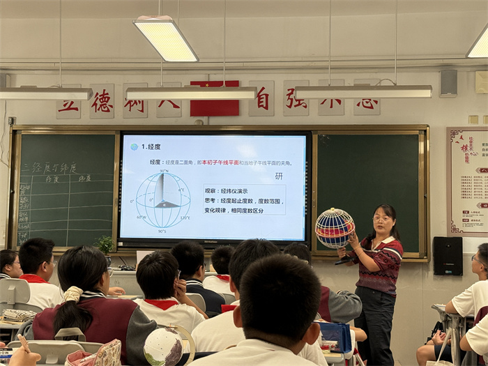 2025年9月16日下午,南门街地理组王凯华老师在初一 4 班开展了一场以 “经纬线与经纬度” 为主题的地理课程,凭借生动的教学形式与丰富的互动环节,赢得学生热烈响应。