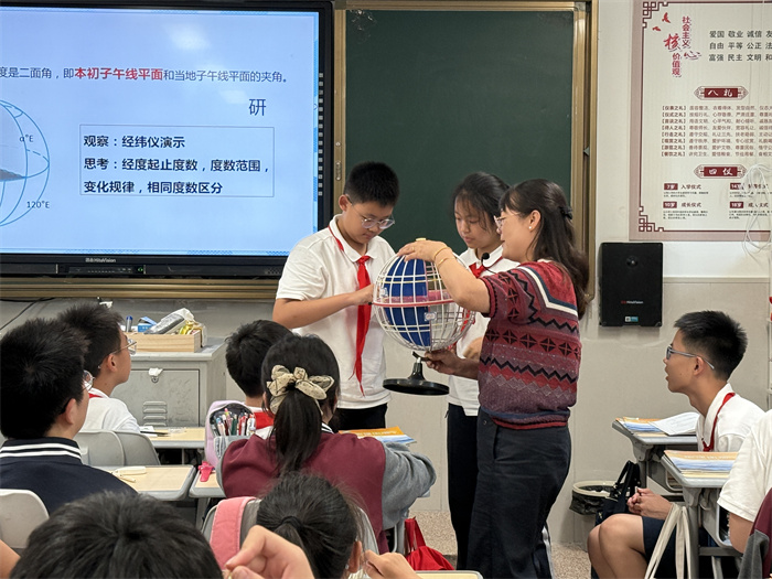 课堂上,面对经纬线经纬度这些抽象知识点,王老师创新教学方式,不仅通过清晰的课件演示梳理经纬线定义、经纬度划分规则,更带来专业的经纬仪进行实物展示。王老师邀请学生近距离观察,触摸经纬仪,标记经纬仪,瞬间点燃课堂氛围。学生们踊跃提问,积极参与,课堂氛围热烈,原本抽象的地理概念在互动中变得直观易懂。