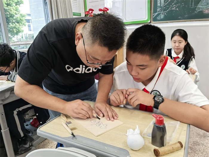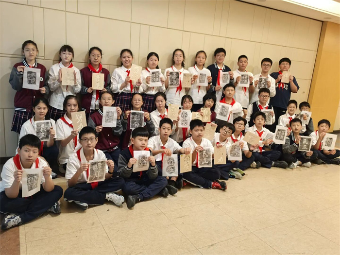 在初一(7)班学生们的好奇与期待中,主题实践课程拉开了帷幕,拓印课老师将一份份材料发到孩子们的手中,还没开讲,孩子们便迫不及待地拆开包装,一样一样地研究起来,在老师的指导下,孩子们用刻刀小心翼翼地雕刻着,接着又用宣纸在刻好的板上拓印,刷水、铺纸、捶打、拍墨……很快一幅作品就出来了,孩子们的激动与开心溢于言表。