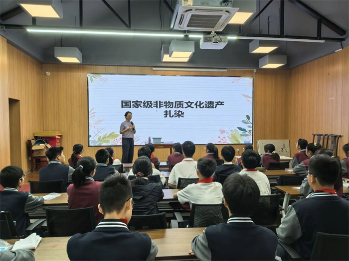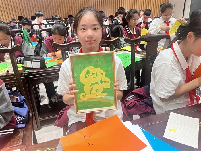 一场别开生面的扬州剪纸非遗课程在旌忠寺小剧场成功举办,市级剪纸非遗传承人庞建东老师亲临现场,为初一(12)班的同学们带来了一场精彩绝伦的传统艺术体验。活动现场,庞老师从扬州剪纸的历史渊源讲起,介绍了剪纸最初是用于为刺绣提供花样。随后,庞老师现场展示了精湛的剪纸技艺,赢得了学生们的阵阵惊叹。在庞老师的指导下,学生们纷纷拿起剪刀和红纸,开始自己的创作之旅。大家沉浸在剪纸的乐趣中,创作出了许多充满童趣和创意的作品。接着,张老师以“数说对称美”为题,结合剪纸艺术,带领同学们遨游数学对称图形、轴对称等知识的海洋。