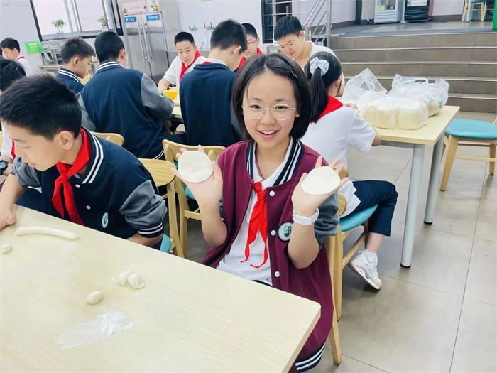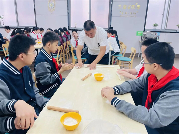 初一(2)班全体同学沉浸式参与“指尖上的美食”主题社会实践活动。活动伊始,面点师傅现场教学和面技巧,细致演示擀面皮的手法。同学们随后亲手实操,从揉面、擀皮到包饺子,在分工协作中体验手工制作的乐趣,品尝自己包的饺子时,更真切感受到劳动成果的香甜。随后,肖翠翠老师带来“指尖上的面食”分享,围绕高粱、小米、粟米等特色农作物,详细讲解其产地特点及在面食制作中的应用,让同学们深刻认识到面食文化与地域农业间的紧密关联,丰富了文化认知。