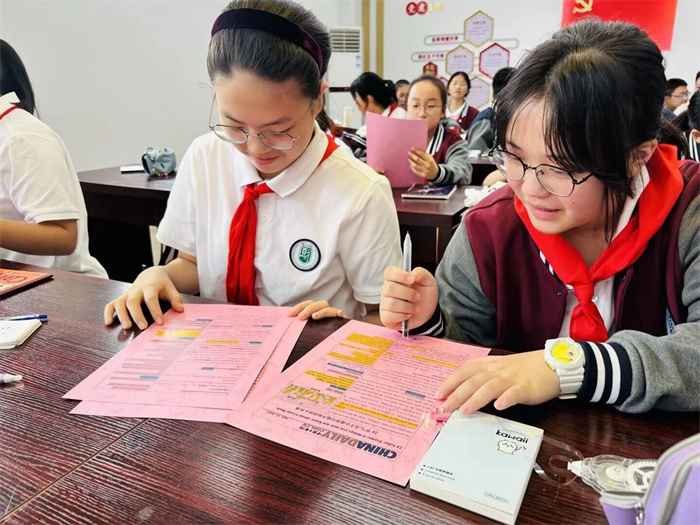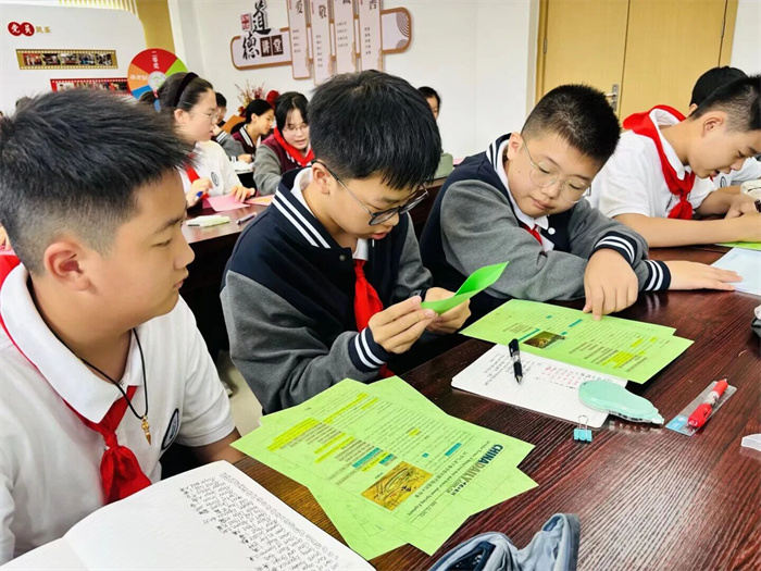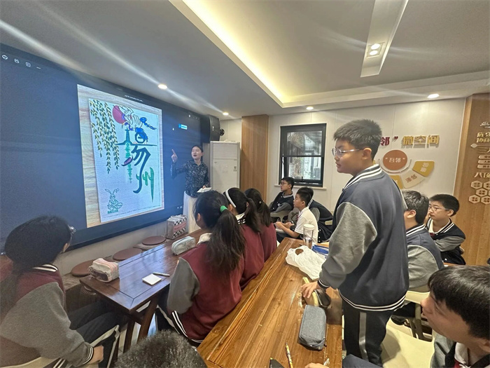 初一(4)班的课堂别开生面。旌忠寺社区内,在“制作扬州主题手帐”课上,季晴老师耐心指导学生构图与配色,同学们则精心绘制瘦西湖的五亭桥、粘贴淮扬美食的贴画,现场气氛热烈。随后,在“英语介绍扬州景点”环节,万婷婷老师与同学们积极互动,耐心纠正发音,并引导大家用更地道的句式描述家乡之美。最终,学生们将亲手完成的英文导游词工整地誊抄在个性手帐上。两节课紧密衔接,师生互动频繁,实现了语言实践、文化传承与美育的深度融合,学生们在创造中收获了知识与自信。