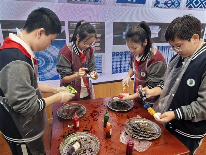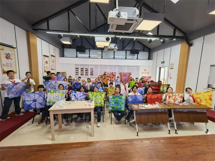 初一(5)班学生也在旌忠寺社区开展了主题实践课程,第一节扎染课,同学们在折布、染色中成就感满满,也懂了手工的珍贵。第二节课程名称是五光拾色,课上同学们做了两个实验,叶绿素的提取和花青素的鉴定。看着花瓣、叶片变出色彩,同学们既懂了科学原理,也爱上自然的神奇。同学们在亲手发现自然奥秘的同时,成就感与好奇心都得到了满足。