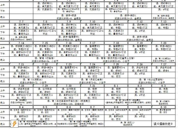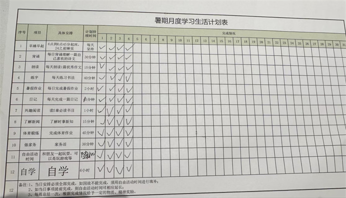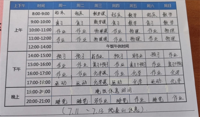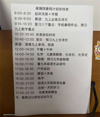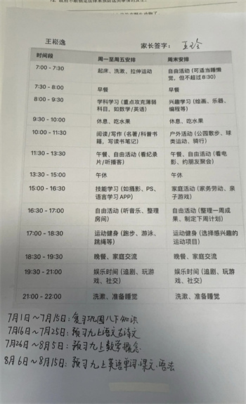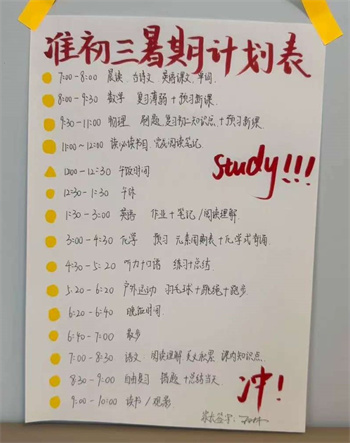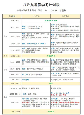 树人学校根据不同年级学生的特点,制定并下发了《暑假生活指导手册》,个性化的学习计划与时间安排。作为新初三的学生,我们都各自制定了学习计划表,每天安排学科知识巩固,涵盖语文、数学、英语等主科。同时则侧重拓展学习,包括课外阅读等。另外还设置1小时体育锻炼时间,跑步、跳绳、球类运动让学生们在阳光下挥洒汗水。