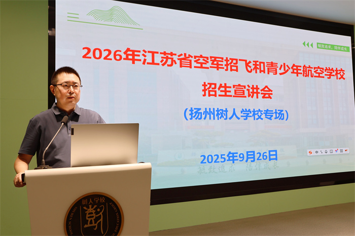 9月26日下午,江苏省空军青少年航校宣传动员会在扬州中学教育集团树人学校(南门街校区)学术报告厅举行。本次活动由树人学校教务处兼教科室主任常松主持,树人学校南门街校区和九龙湖校区对航空飞行感兴趣的初二、初三男生及其家长参加本次活动,九龙湖校区学生及家长收看了同步直播。