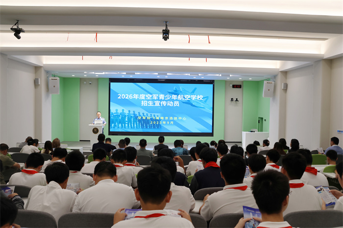 活动伊始,空军招飞局南京选拔中心闫晓双中校就空军青少年航校的情况进行宣讲。闫晓双中校详细介绍了青少年航空学校建设的背景、青少年航校的教学实施与教育管理、青少年航校的就读优势等方面内容。闫晓双中校还分享了他过去两年作为航校辅导员、参与青少年航空班教育管理的亲身经历与感受,并对2026届青少年航校的招生日程等进行了说明。
