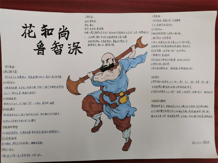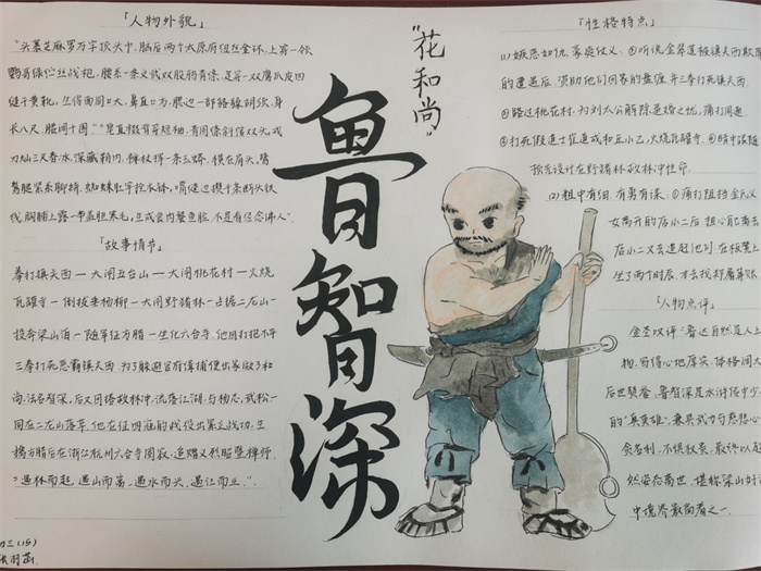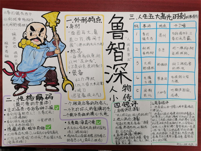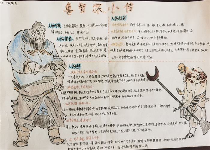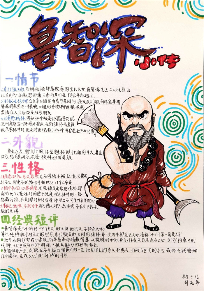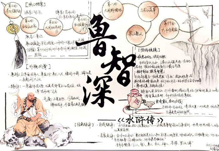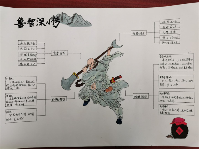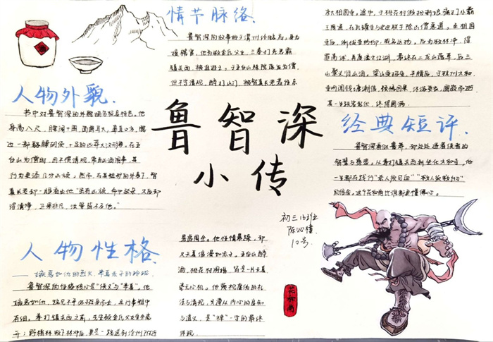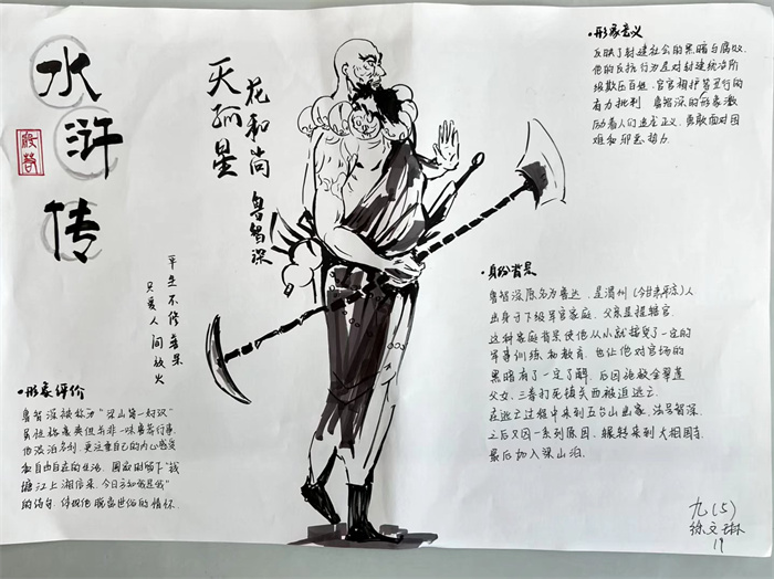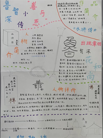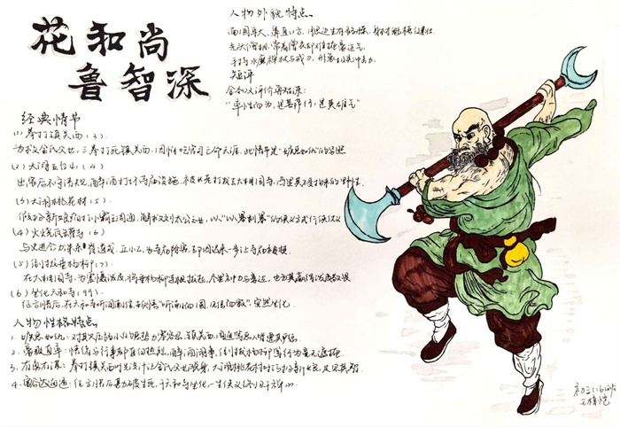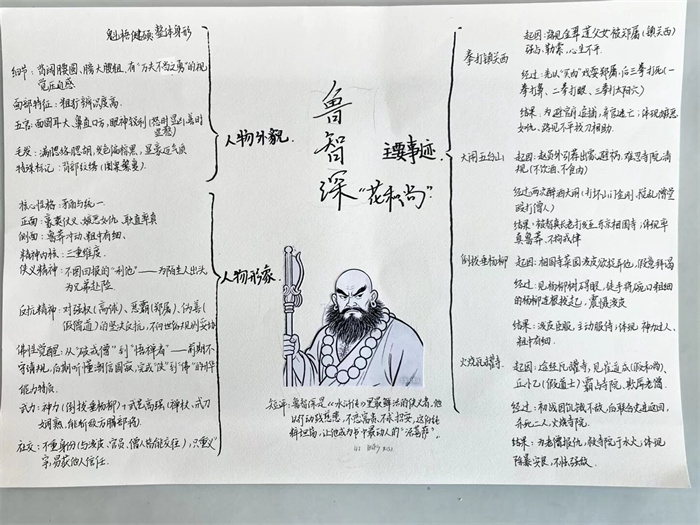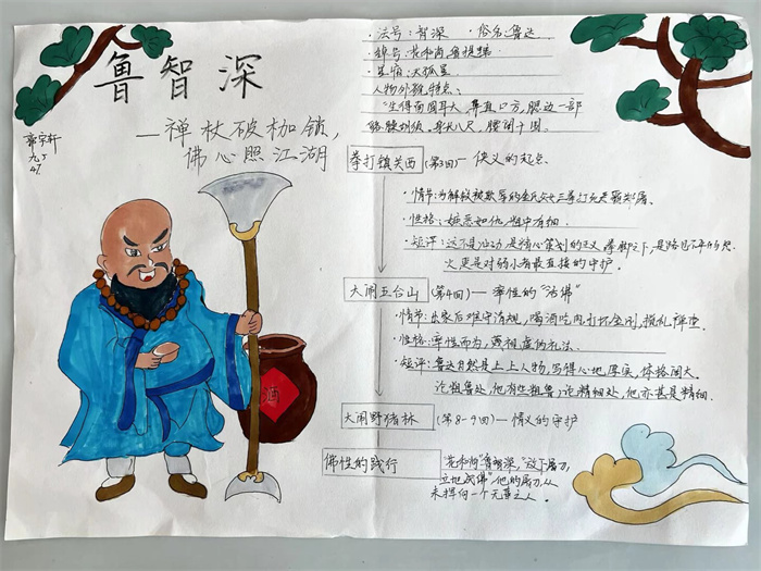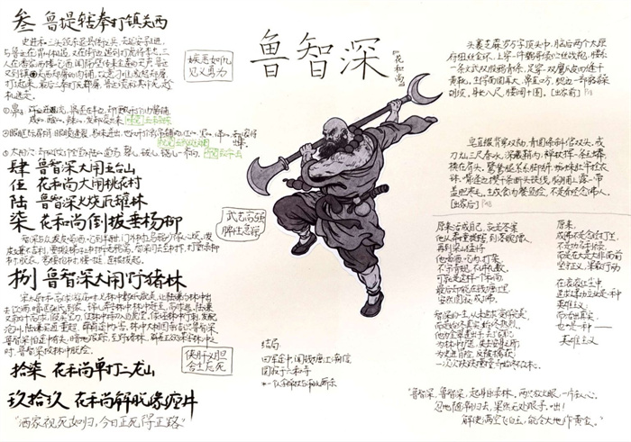 同学们提交的作品形式多样,创意纷呈:有的同学绘制了精美的思维导图,线条清晰,逻辑严谨,将鲁智深的人生轨迹与性格演变直观呈现;有的同学撰写了文采斐然的人物评传,分析透彻,引证丰富;更有同学发挥美术特长,以连环画或漫画形式,图文并茂地再现了鲁智深的经典场面,并配以精当的点评。在短评部分,既有学生引用金圣叹等古代评点家的精辟论述,也不乏充满独立思考的见解,如“鲁智深的‘禅杖打开危险路,戒刀杀尽不平人’,是其侠义精神最生动的注脚”、“他看似不拘小节,实则内心自有尺度与慈悲,是真正‘赤条条来去无牵挂’的真佛子”等,展现了当代少年对古典文学形象的深刻感悟与创新理解。