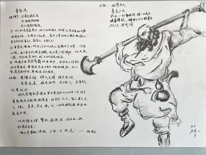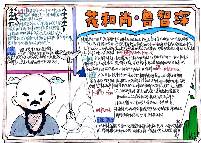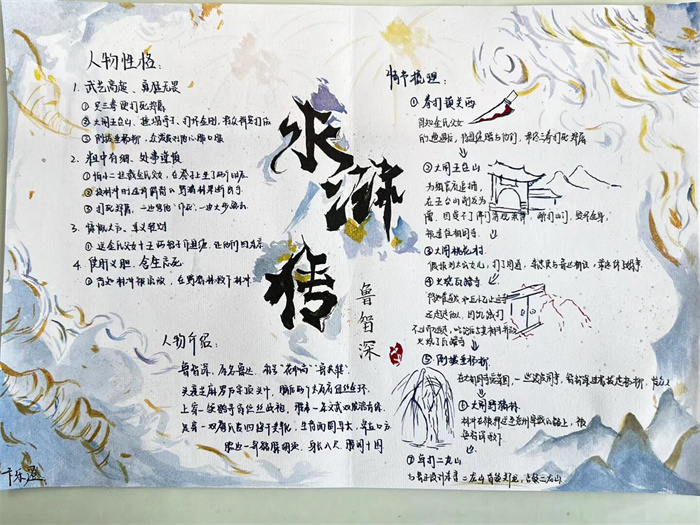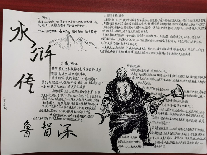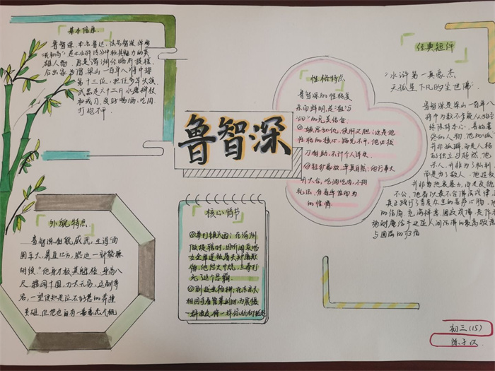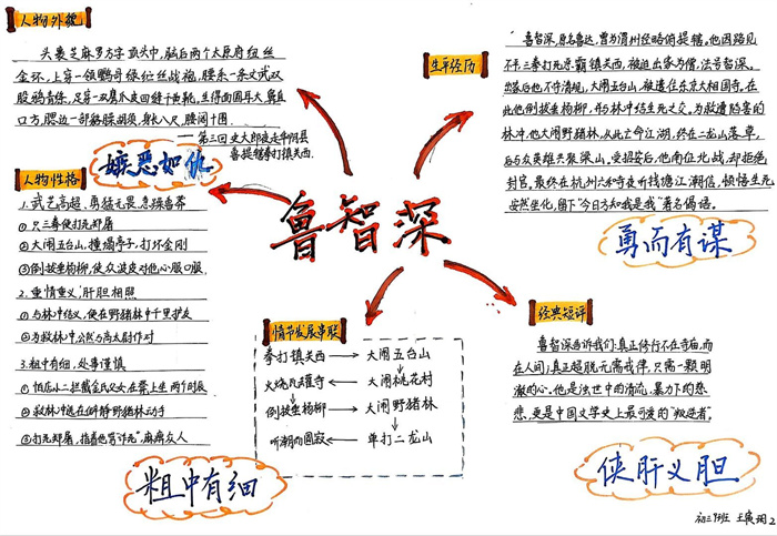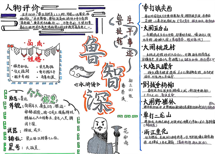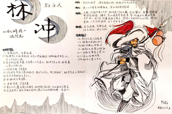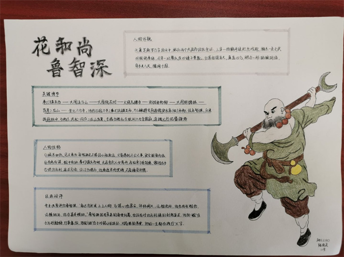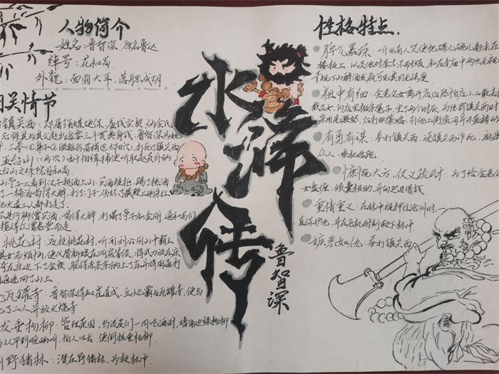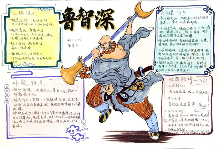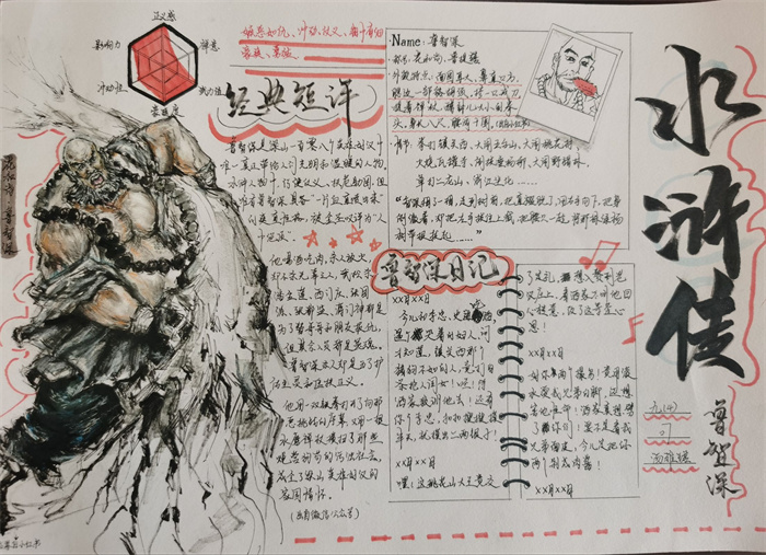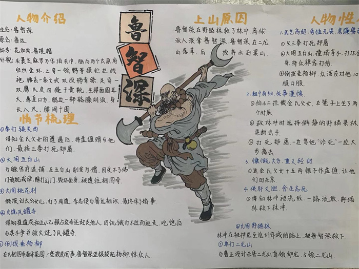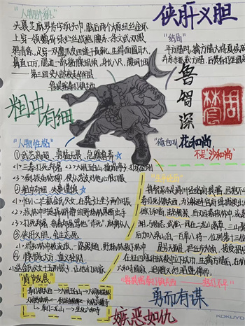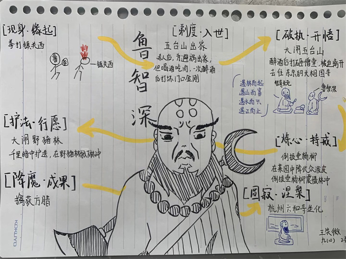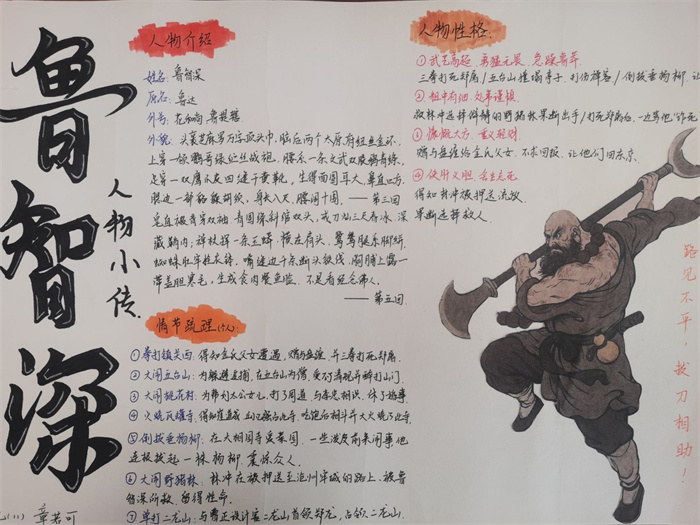 同学们提交的作品形式多样,创意纷呈:有的同学绘制了精美的思维导图,线条清晰,逻辑严谨,将鲁智深的人生轨迹与性格演变直观呈现;有的同学撰写了文采斐然的人物评传,分析透彻,引证丰富;更有同学发挥美术特长,以连环画或漫画形式,图文并茂地再现了鲁智深的经典场面,并配以精当的点评。在短评部分,既有学生引用金圣叹等古代评点家的精辟论述,也不乏充满独立思考的见解,如“鲁智深的‘禅杖打开危险路,戒刀杀尽不平人’,是其侠义精神最生动的注脚”、“他看似不拘小节,实则内心自有尺度与慈悲,是真正‘赤条条来去无牵挂’的真佛子”等,展现了当代少年对古典文学形象的深刻感悟与创新理解。
