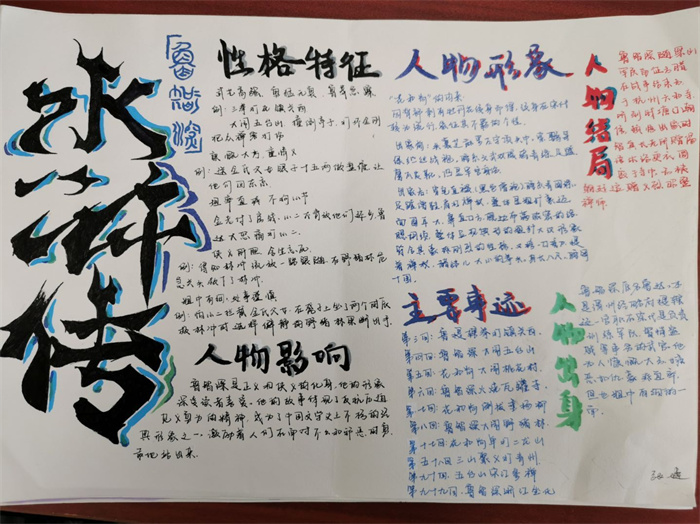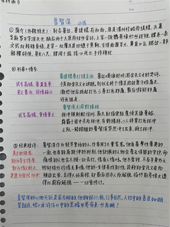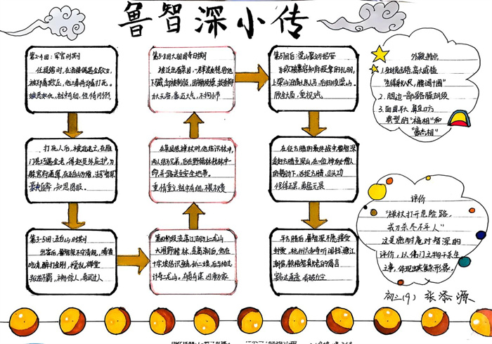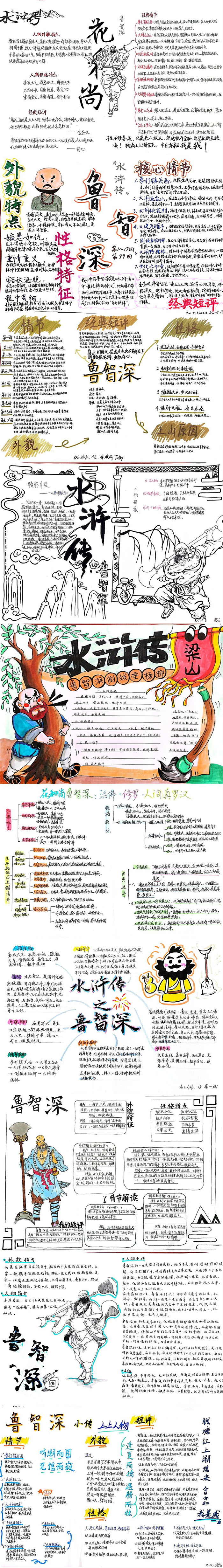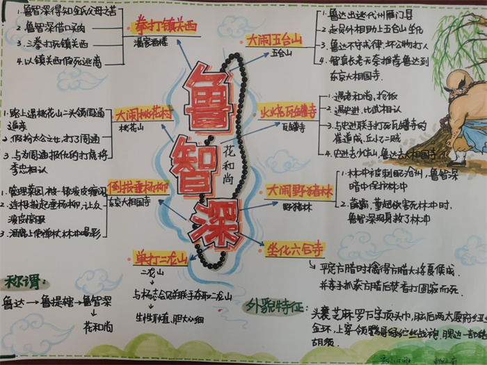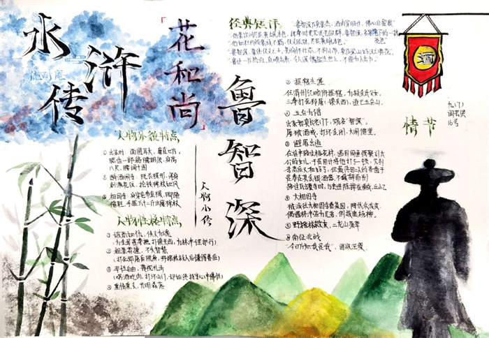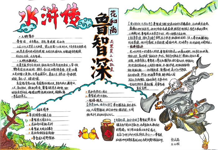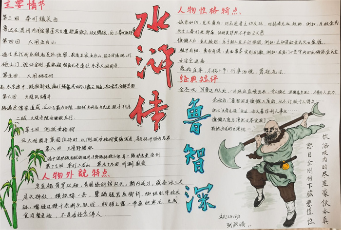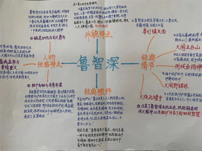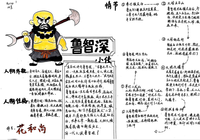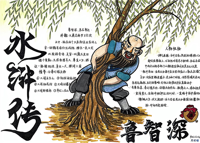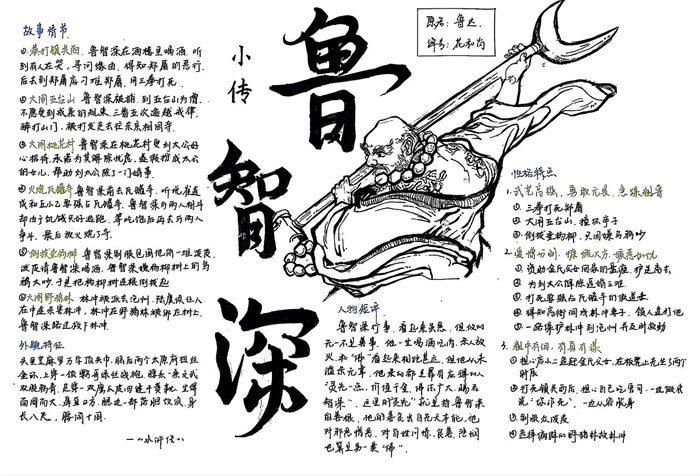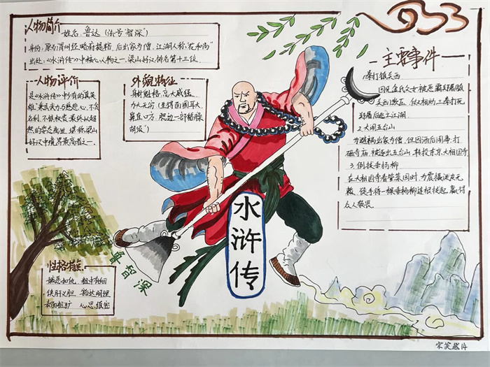 同学们提交的作品形式多样,创意纷呈:有的同学绘制了精美的思维导图,线条清晰,逻辑严谨,将鲁智深的人生轨迹与性格演变直观呈现;有的同学撰写了文采斐然的人物评传,分析透彻,引证丰富;更有同学发挥美术特长,以连环画或漫画形式,图文并茂地再现了鲁智深的经典场面,并配以精当的点评。在短评部分,既有学生引用金圣叹等古代评点家的精辟论述,也不乏充满独立思考的见解,如“鲁智深的‘禅杖打开危险路,戒刀杀尽不平人’,是其侠义精神最生动的注脚”、“他看似不拘小节,实则内心自有尺度与慈悲,是真正‘赤条条来去无牵挂’的真佛子”等,展现了当代少年对古典文学形象的深刻感悟与创新理解。