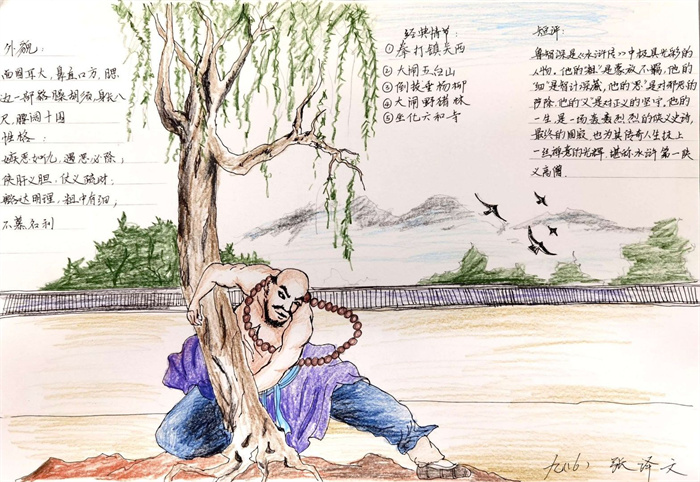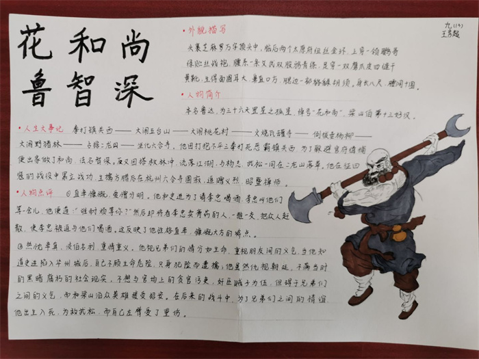 当经典名著邂逅创新思维,当笔墨纸砚碰撞个性表达,这个国庆假期,树人学校南门街校区初三年级的同学们完成了一份别开生面的语文作业。为深化对古典文学名著的理解,提升综合素养,初三语文组于国庆假期精心策划并布置了以“为花和尚立传”为主题的《水浒传》深度阅读与创作实践作业,引导学生们为经典人物鲁智深绘制个性小传,收获丰硕成果。