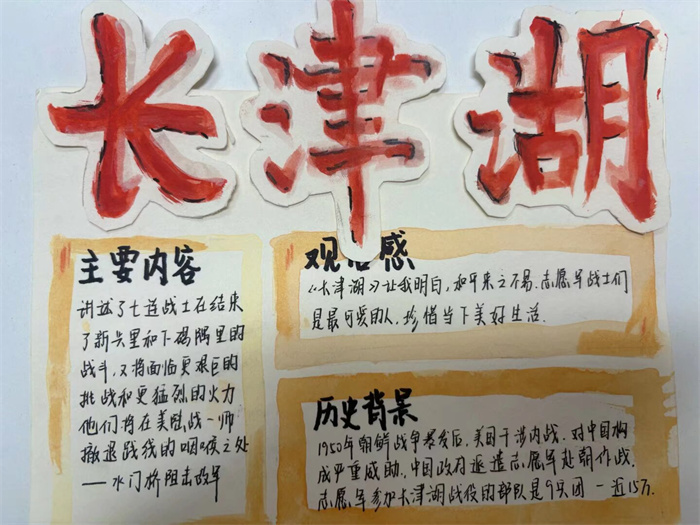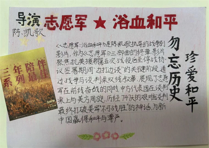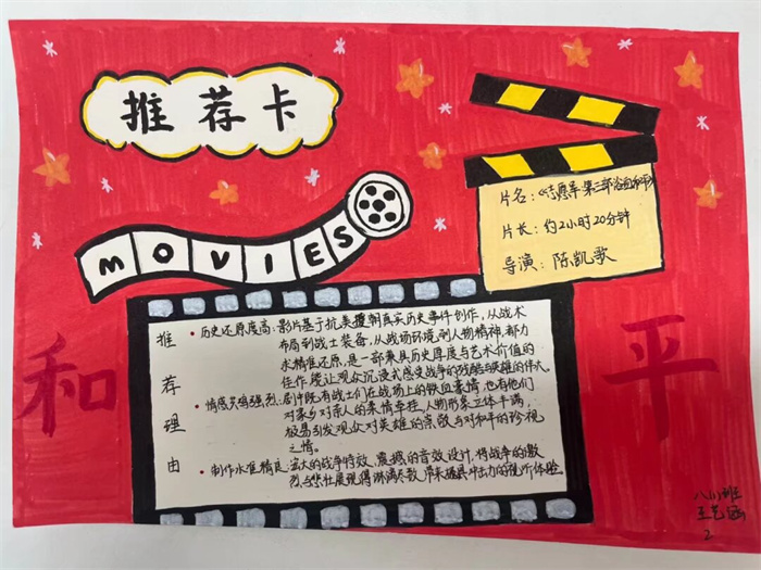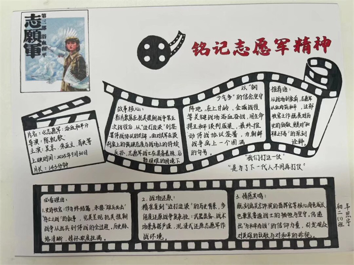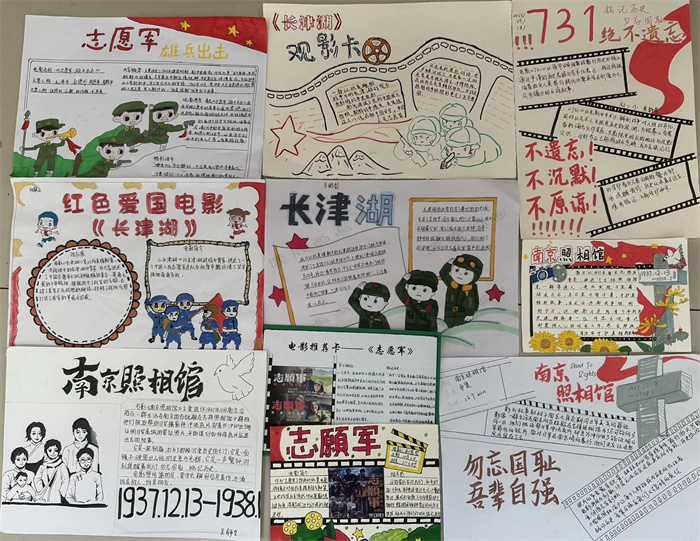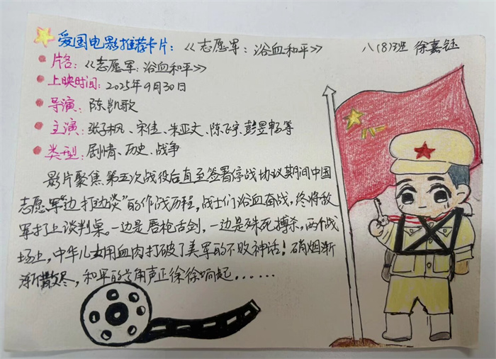 在国庆节期间,同学们通过观看《我和我的祖国》《长津湖》等经典影片,深刻感悟了革命先烈的英勇事迹和祖国的伟大成就。观影后,同学们精心制作了“国庆观影卡”,用文字记录下自己的感受与思考。一张张卡片上,既有对历史的回顾,也有对未来的展望,展现了新时代少年的爱国情怀。