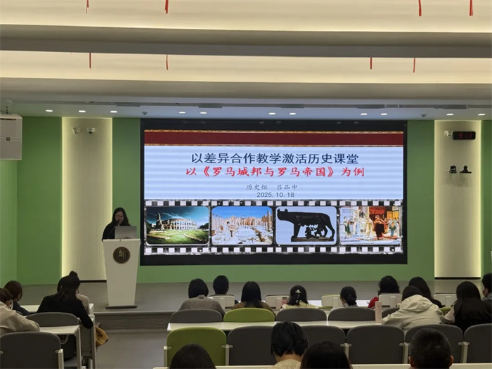 “差异·合作”课堂教学范式实践分享环节里,吕品申老师以《罗马城邦与罗马帝国》为例,作了题为"以差异合作教学激活历史课堂"的教学范式分享。她在分享中介绍,通过将班级分为"共和国"与"帝国"两大研究团队,并在每个团队内设置"政治架构师""社会观察家""精神诠释者"等专业角色,实现了让每个学生都能发挥自身特长的差异化教学。在课堂实施环节,"专家论证会"和"跨时代对话"的设计,有效激发了学生的思辨能力与探究热情。"条条大路通罗马。"吕老师用这句古老的谚语形象地阐释了她的教学理念,"教育的真谛在于尊重每个孩子的独特性,为他们开辟不同的成长路径。"她表示,这种差异合作教学模式不仅加深了学生对历史知识的理解,更培养了他们的核心素养,让历史课堂真正成为了学生思维成长的沃土。