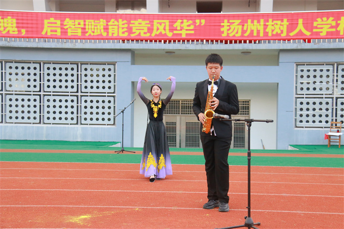 闭幕式以一场活力满格的表演拉开帷幕。初一年级全体学子身着统一校服,迈着整齐步伐登场,带来广播操展示。抬手、转身、跳跃,每一个动作都精准划一,舒展的姿态里尽显少年朝气,赢得台下阵阵喝彩。随后,初一年级小合唱成员轻声唱起《世界赠予我的》,清澈歌声缓缓流淌,传递出少年对生活的热爱与对未来的憧憬,让现场氛围愈发温暖。压轴登场的萨克斯与舞蹈表演《花儿为什么这样红》更将气氛推向高潮 —— 萨克斯手初二(16)班赵洺宸同学奏响悠扬旋律,初一(15)班陈沐菡同学身着明艳服饰翩翩起舞,乐器的醇厚与舞蹈的柔美相得益彰,展现出树人学子多元的艺术风采。