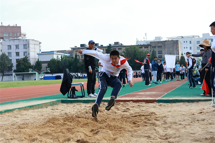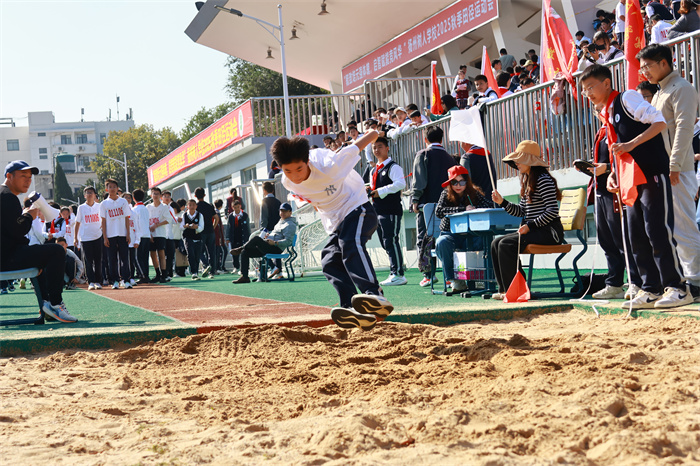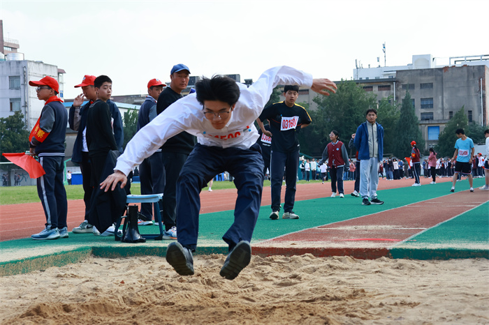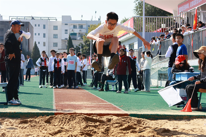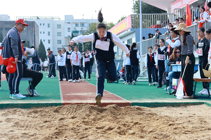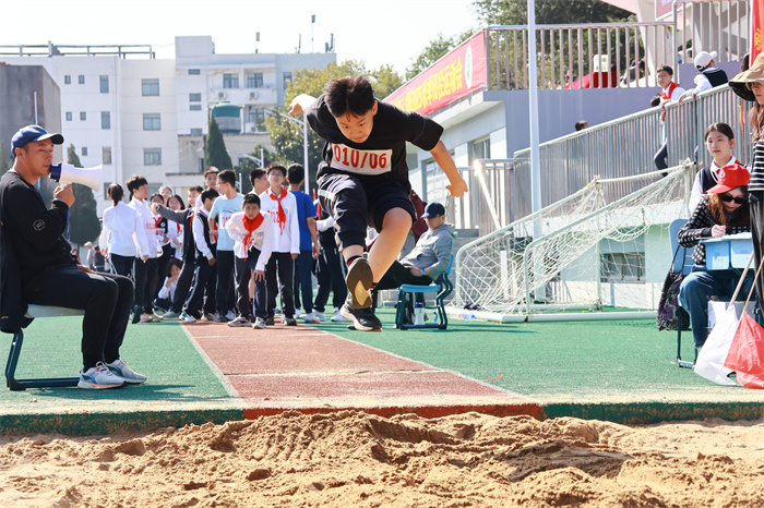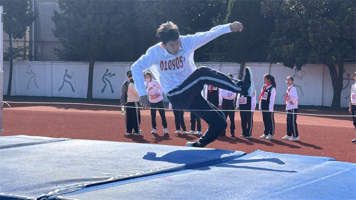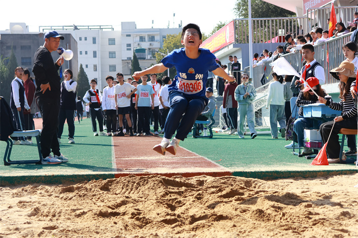 初一 15 班来稿!男子跳远:沙坑旁的助跑线,是少年逐梦的起点。张誉晟目光锁定前方,脚步伴着呐喊加速,风拂过他的衣角,藏着不被定义的热烈与张扬。沙粒飞溅的瞬间,是青春最鲜活的印记;跃出的距离,是少年不服输的倔强。