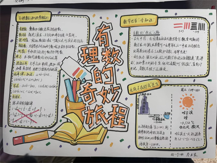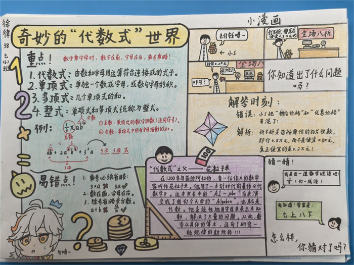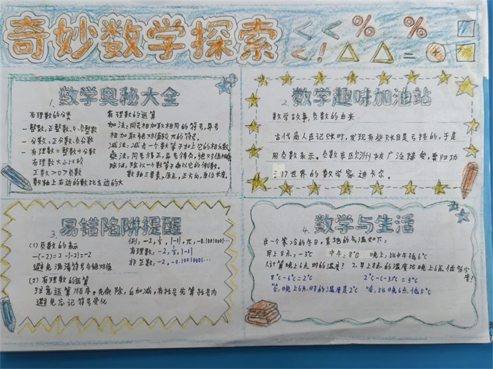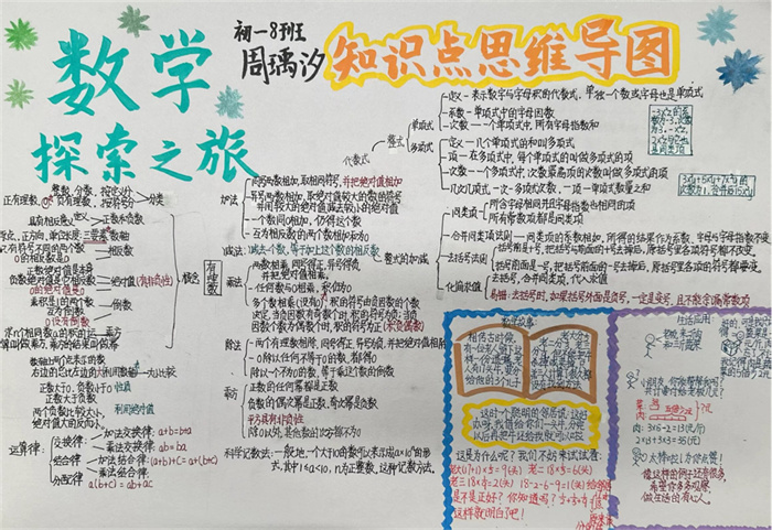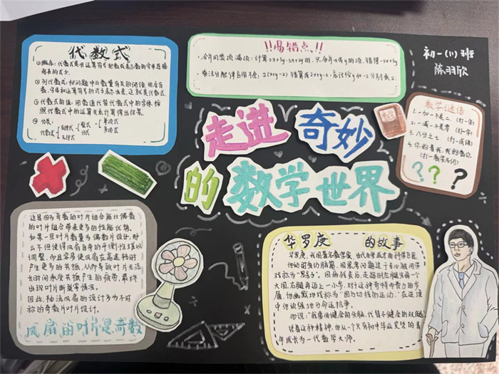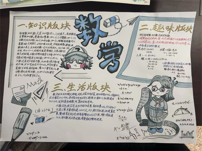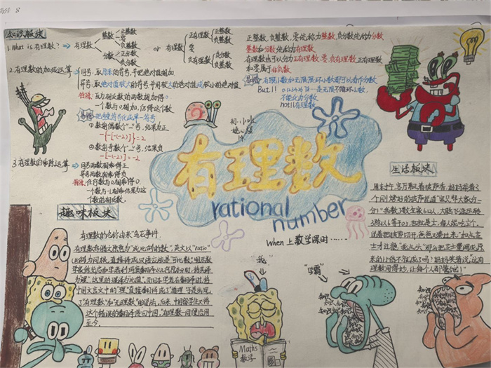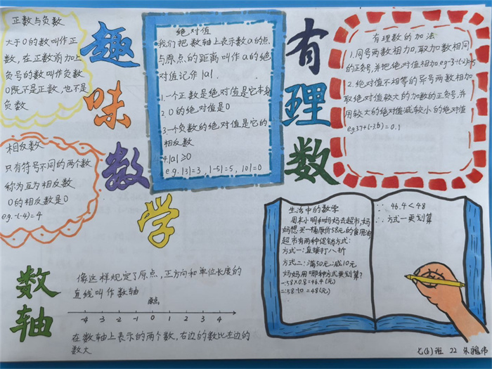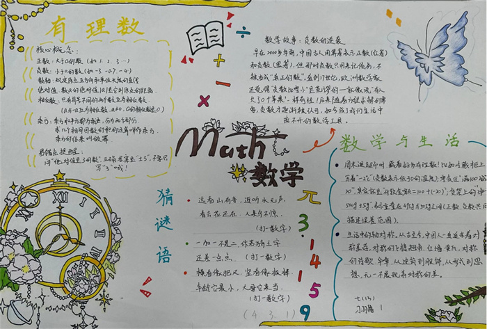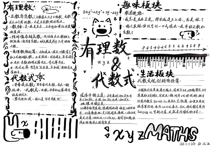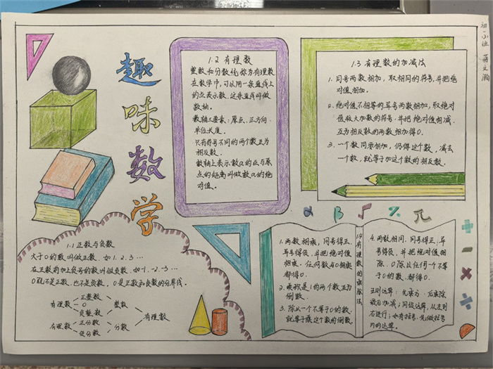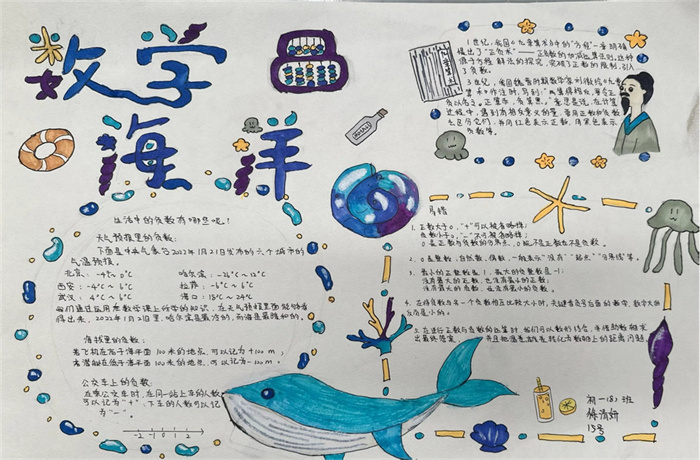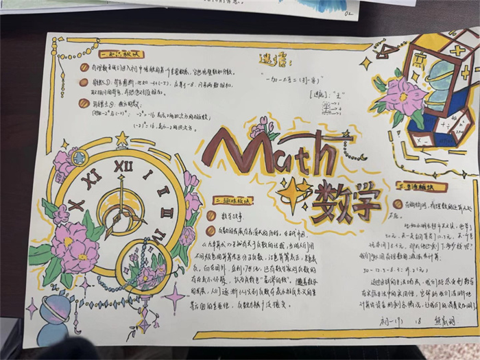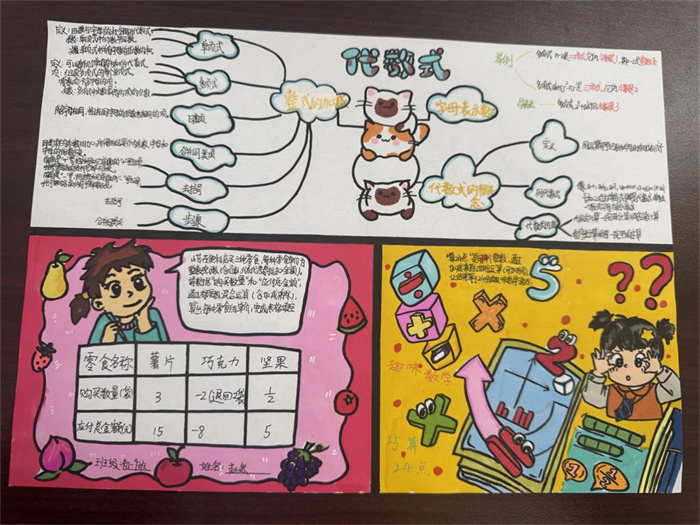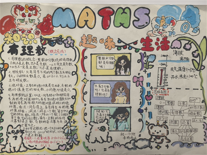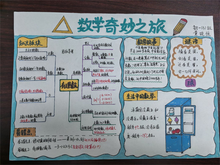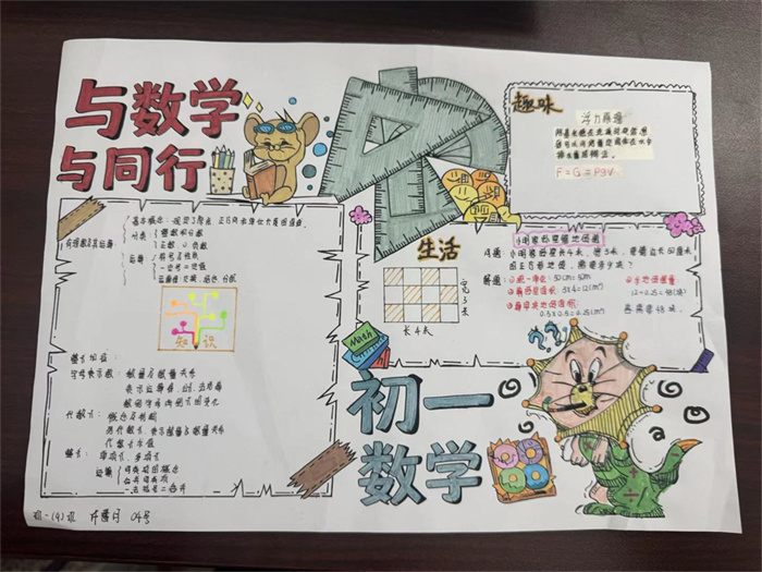 本次手抄报展既考验同学们的知识梳理能力,也解锁了数学学习的新玩法。知识板块里,思维导图清晰串联已学内容,搭配易错点分析,让课本概念“可视化”;趣味板块中,负数发展史、数学谜题、原创漫画轮番登场,打破“数学=做题”的刻板印象;生活板块则把数学搬进日常——从超市计价中的有理数运算,到家居测量里的线段应用,让知识与生活“双向奔赴”。
