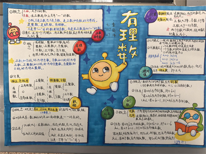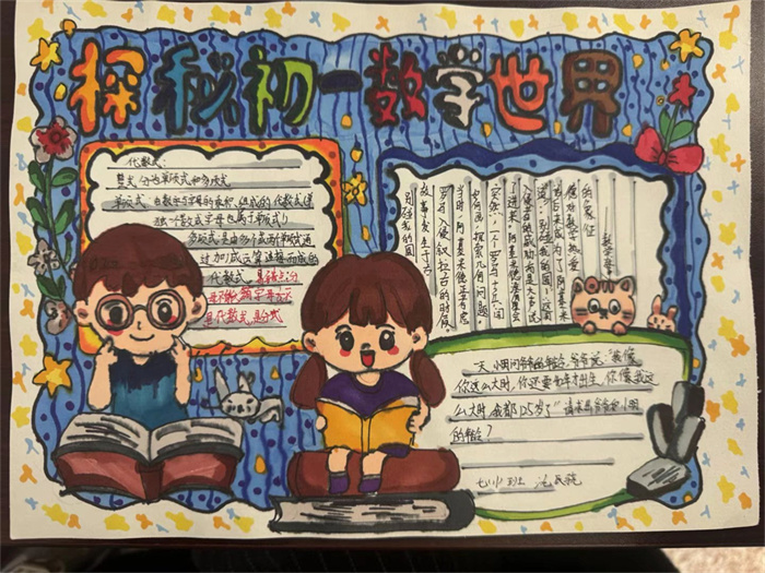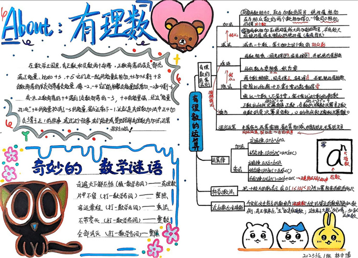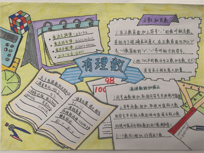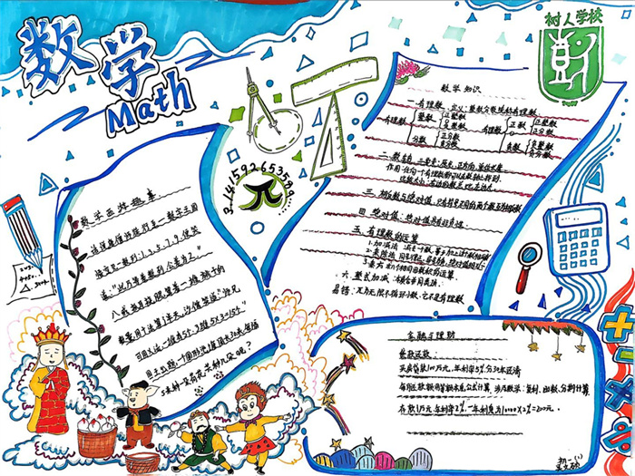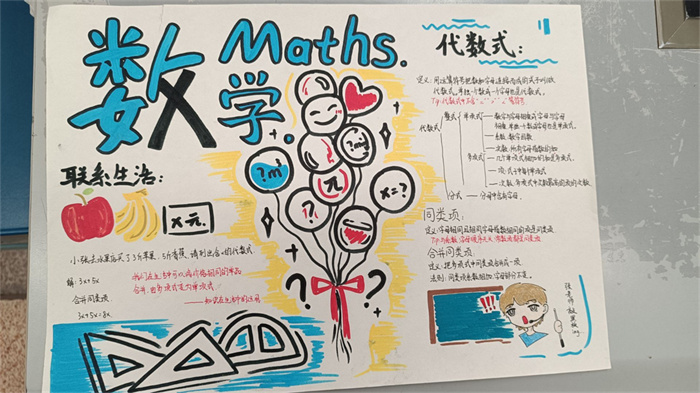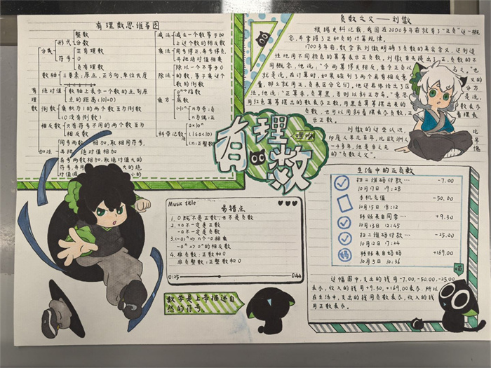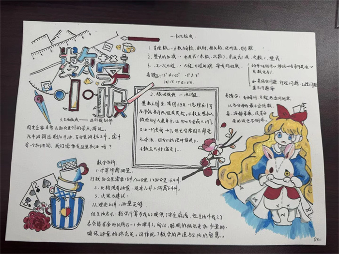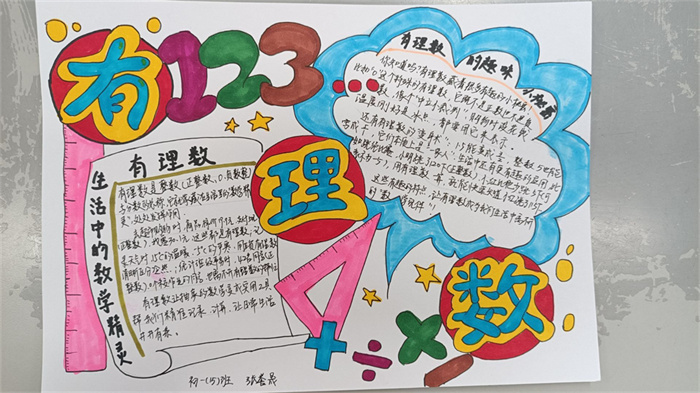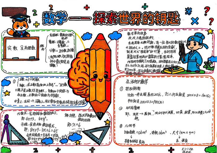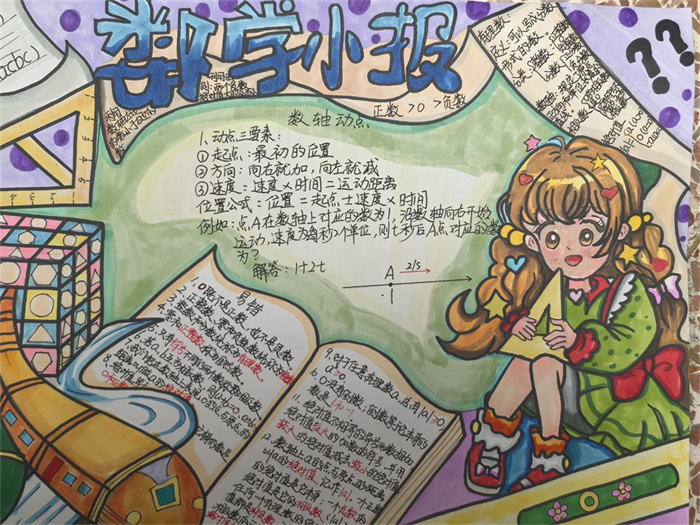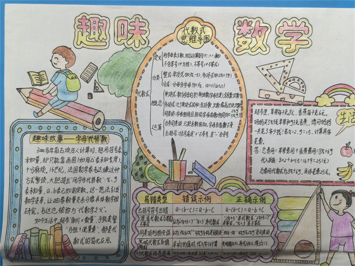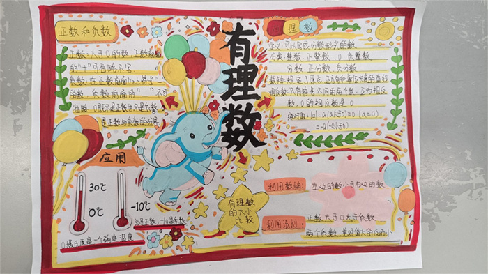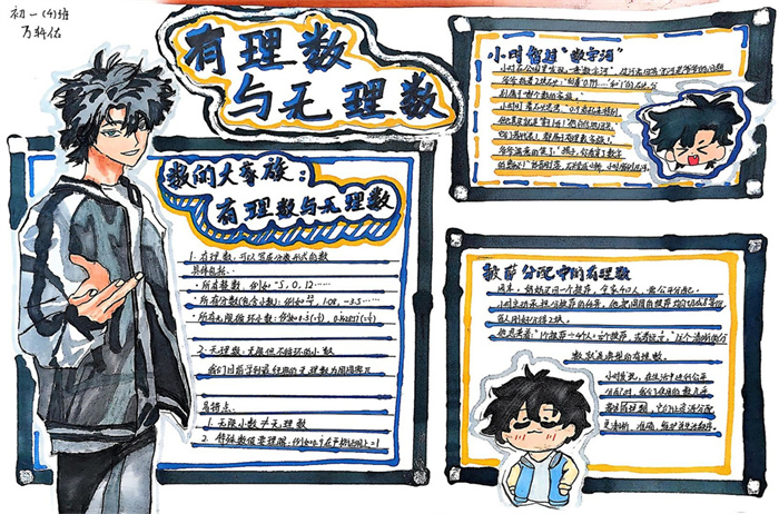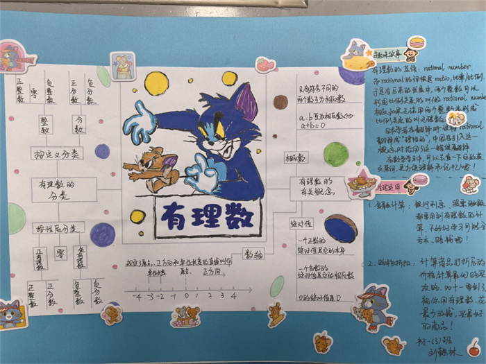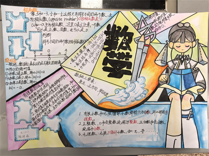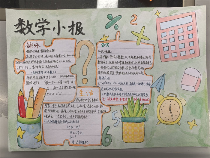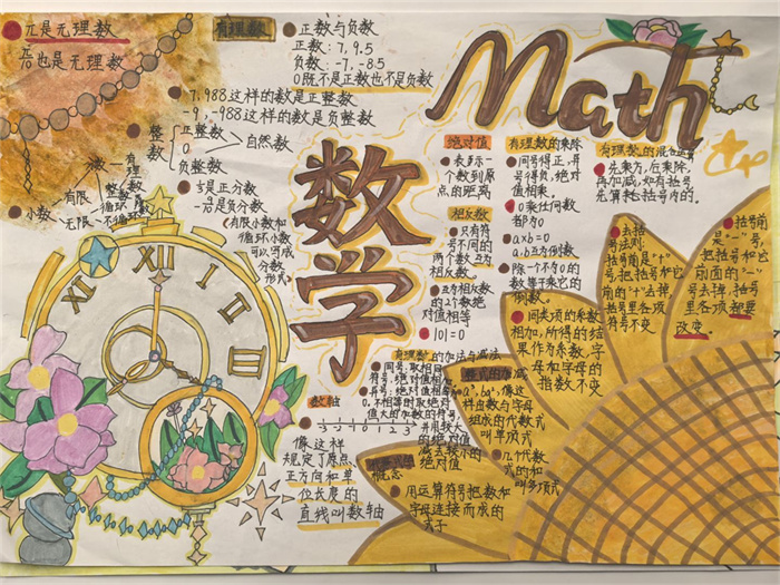 本次手抄报展既考验同学们的知识梳理能力,也解锁了数学学习的新玩法。知识板块里,思维导图清晰串联已学内容,搭配易错点分析,让课本概念“可视化”;趣味板块中,负数发展史、数学谜题、原创漫画轮番登场,打破“数学=做题”的刻板印象;生活板块则把数学搬进日常——从超市计价中的有理数运算,到家居测量里的线段应用,让知识与生活“双向奔赴”。