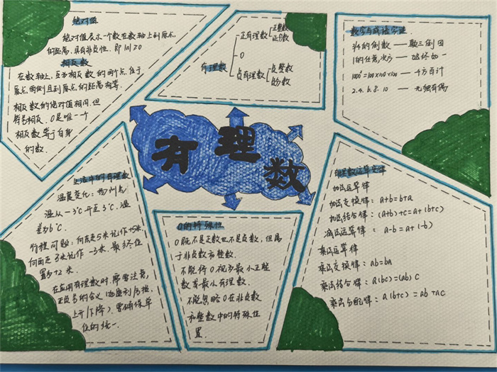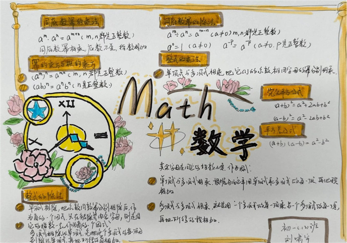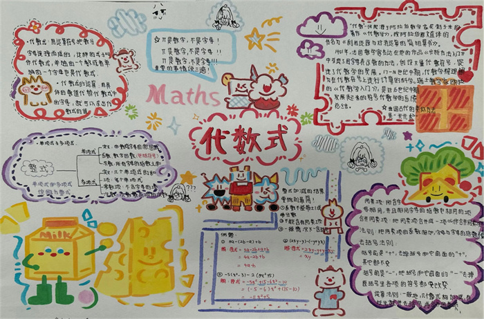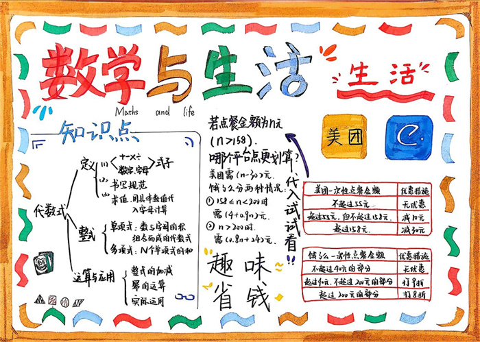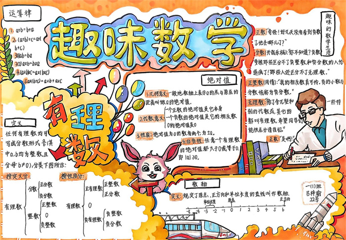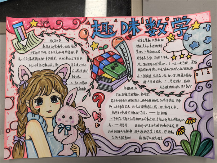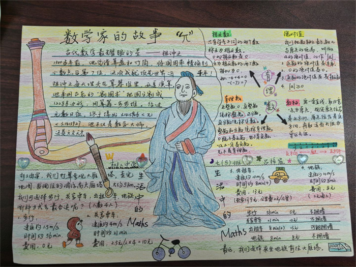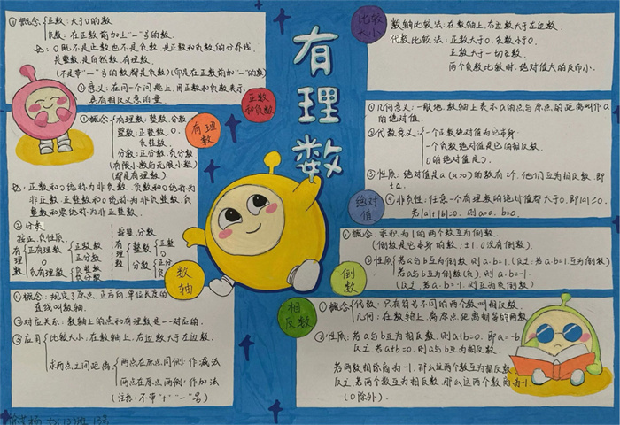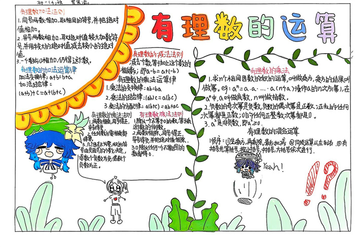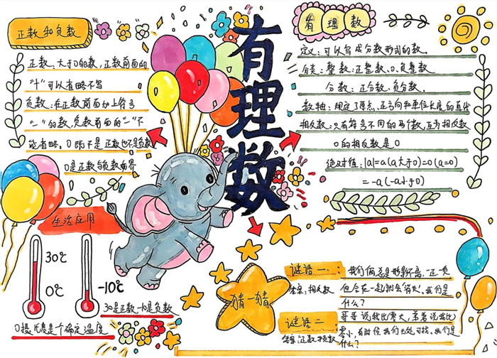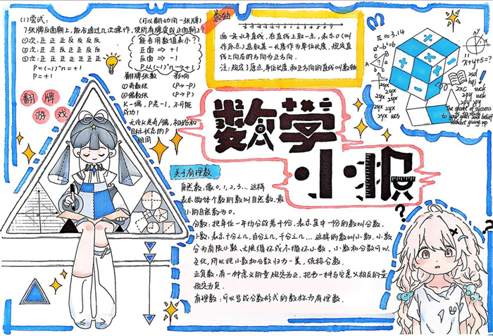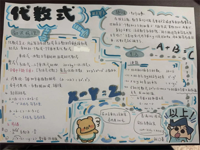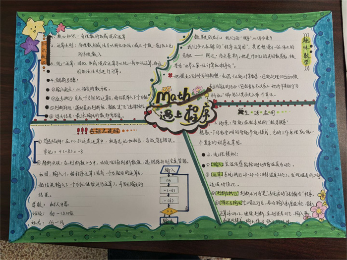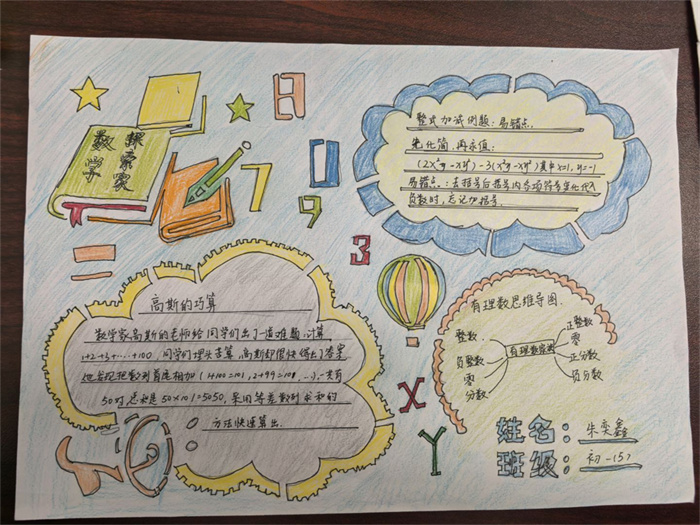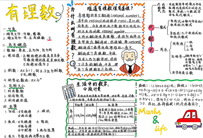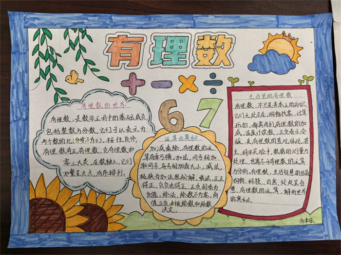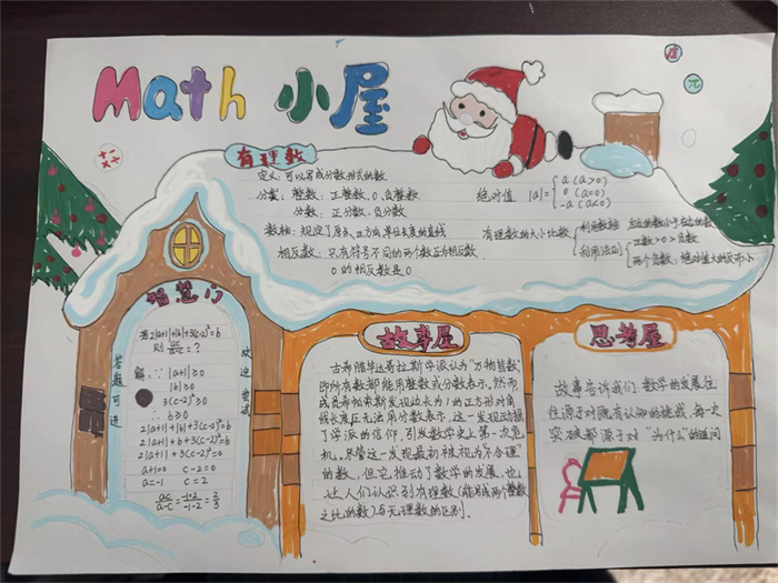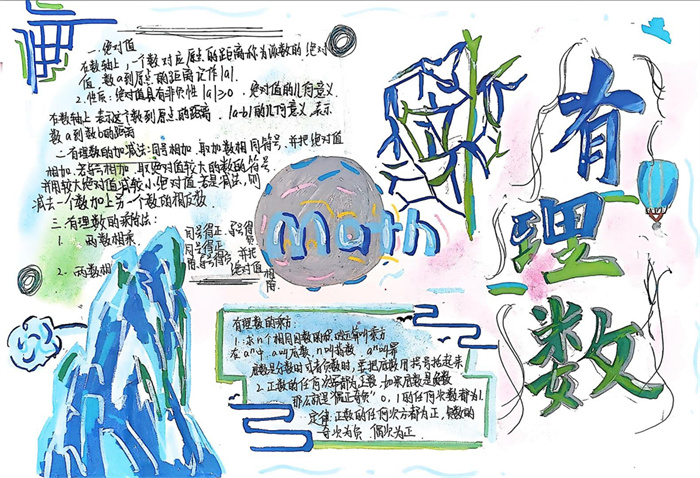 本次手抄报展既考验同学们的知识梳理能力,也解锁了数学学习的新玩法。知识板块里,思维导图清晰串联已学内容,搭配易错点分析,让课本概念“可视化”;趣味板块中,负数发展史、数学谜题、原创漫画轮番登场,打破“数学=做题”的刻板印象;生活板块则把数学搬进日常——从超市计价中的有理数运算,到家居测量里的线段应用,让知识与生活“双向奔赴”。