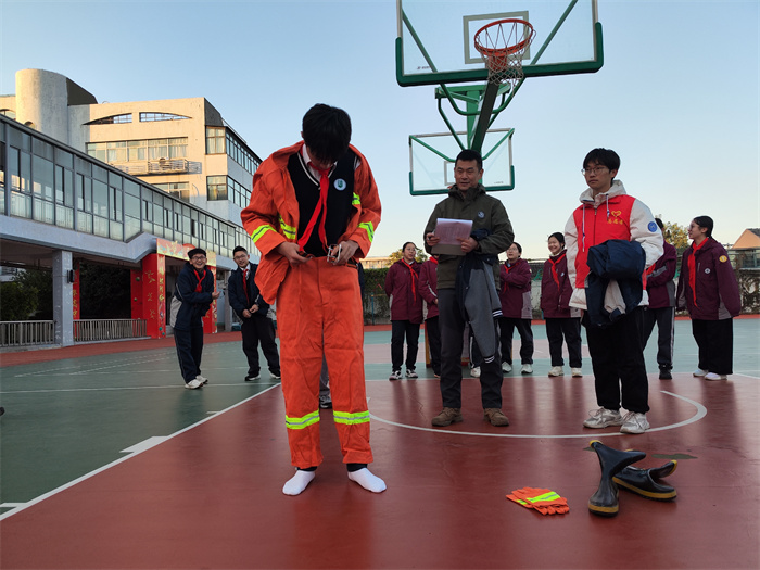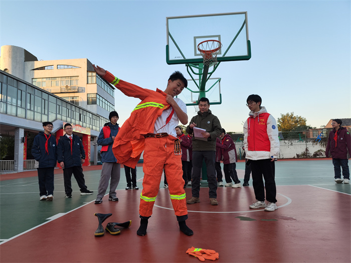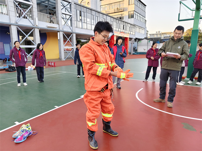 "预备——开始!"随着一声令下,同学们迅速动手,穿消防服、戴头盔、系腰带、换靴子,动作娴熟,一气呵成。最终一名大队委成员以47秒32的成绩率先完成,赢得阵阵掌声。