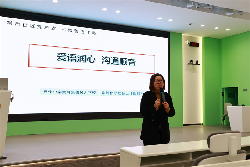 “润心赋能”环节,常府社区党总支依托“民微善治工程”,联合扬州中学教育集团树人学校、扬州智心社会工作服务中心,开展“爱语润心,沟通顺音”主题活动。活动以“从心出发 用爱表达”“觉察接纳,创造当下”为核心理念,通过分享交流,传递温暖沟通的方式,也为教师们提供了心理调适与育人方法的实用指导。