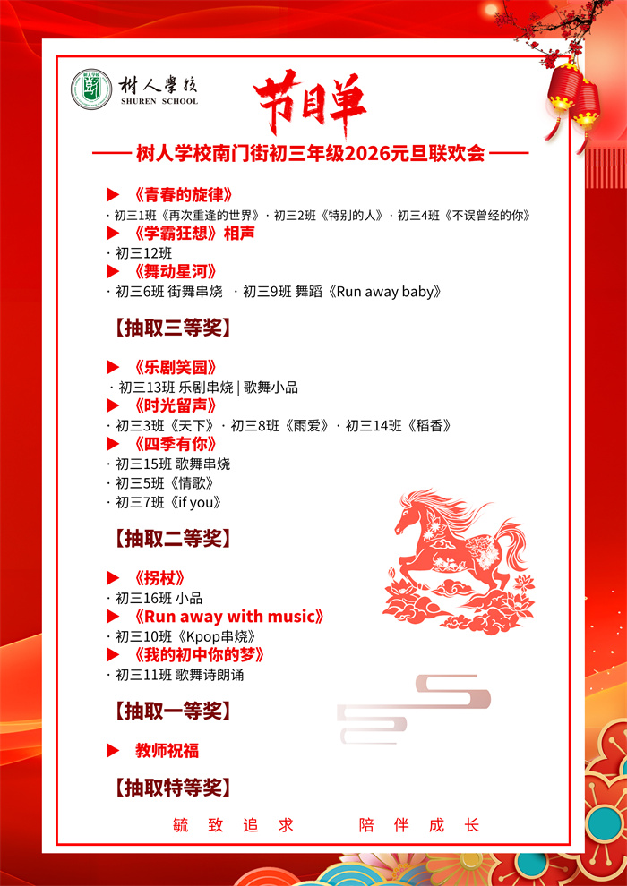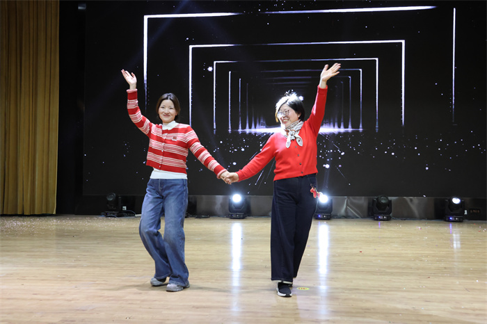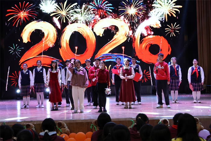 最后,年级主任和班主任们走上舞台,以舞台秀的形式为大家送来祝福。祝愿全体师生“新年快乐!2026,马到成功!”师生互动,陪伴成长,为2025画上圆满的句号,2026,我们再创辉煌!