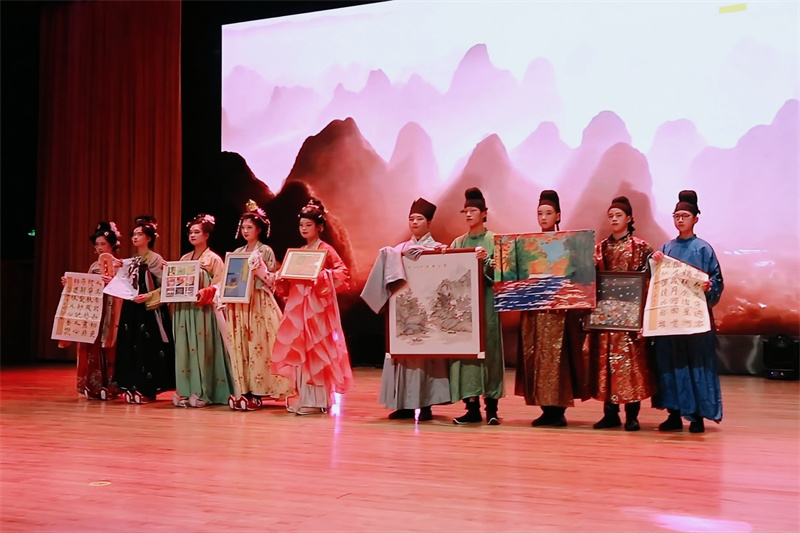活动在浓郁的文化底蕴中拉开帷幕。同学们身着典雅汉服,步履从容,一场国风秀瞬间将观众带入古典美学的意境。随后,柔美而富有韧劲的独舞《西楼别序》翩然呈现,舞者用身体语言诉说别绪与坚守。紧接着,铿锵有力的集体朗诵《定风波》响彻会场,“竹杖芒鞋轻胜马”的旷达之声,展现了树人学子面对风雨的从容气度。独唱与群舞相结合的《光亮》,歌声清澈坚定,舞姿灵动充满希望,配合现场同步展示的书画作品,墨香与乐韵交融,共同勾勒出青春生命的厚重底色——那是在中华优秀传统文化熏陶下形成的自信风骨与初心理想。