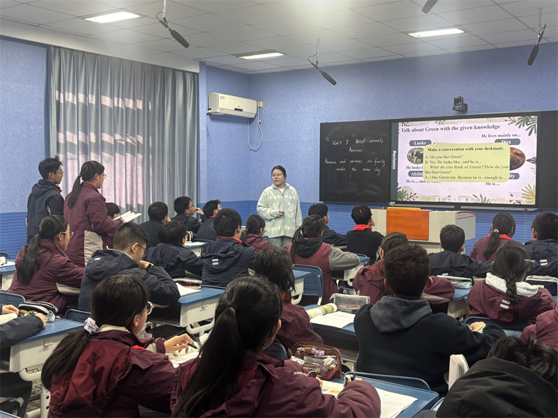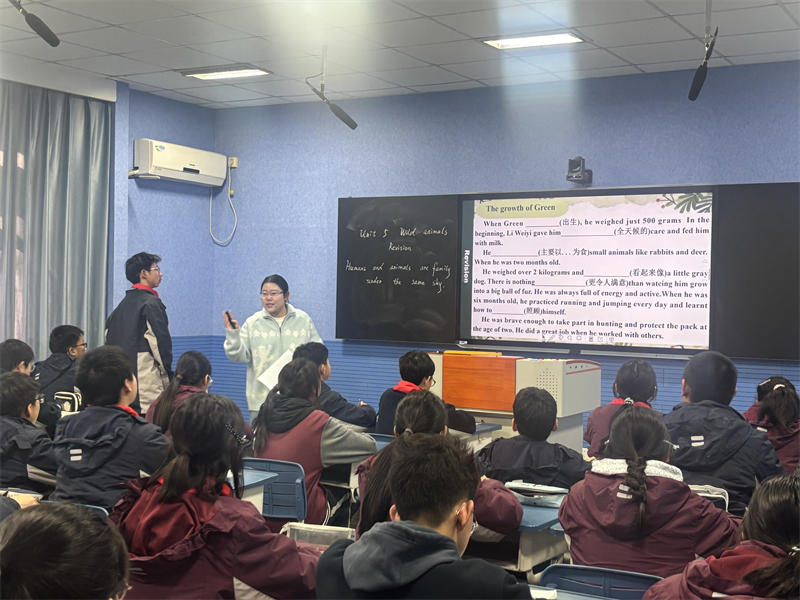 随后,孙玥老师呈现了八年级《Unit 5 Wild animals Revision》复习课。孙老师紧扣“人与自然”主题,独具匠心地以中国纪实故事“李微漪与格林”为主线,将野生动物保护这一全球议题具象化、情感化、本土化。课程通过真实动人的叙事,引导学生综合运用单元语言知识,深入探讨生物多样性保护、人与自然命运共同体等议题,成功地将语言能力训练、生态意识培养和社会责任感激发融为一体,体现了英语学科工具性与人文性的高度统一。