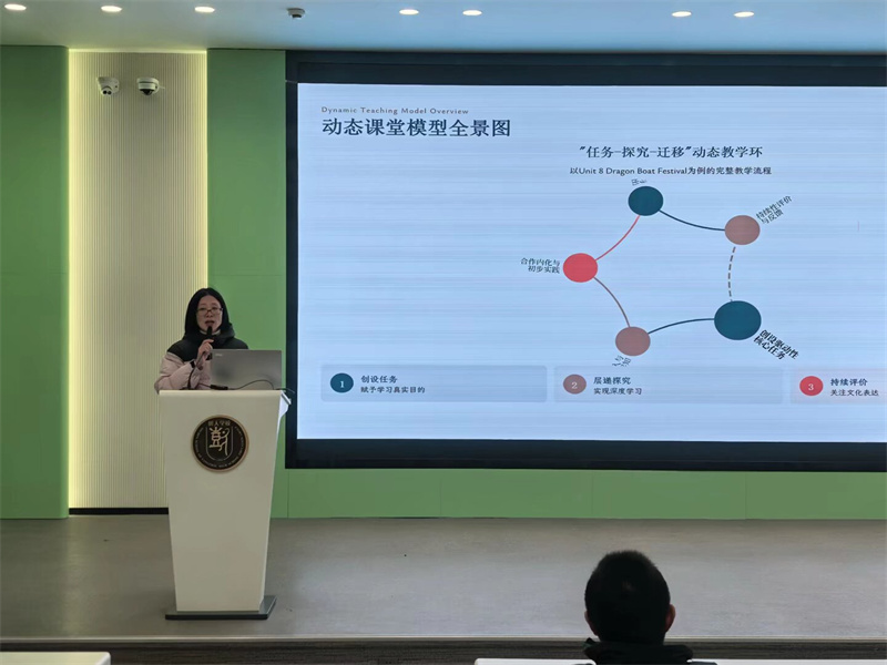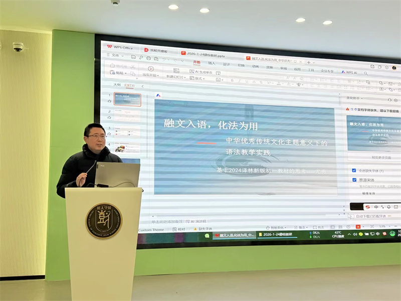 英语教研组尤勇老师带领全组老师学习“中华优秀传统文化主题意义下的语法教学实践”的期刊文章。尤老师基于作者观点,围绕2024译林新版初一教材,结合自身研究,阐述“融文入语”的语法教学理念,详解从“修身”到“平天下”的教材文化脉络与“任务-探究-迁移”课堂模型,为在场英语教师提供了兼具深度与实操性的教学参考。