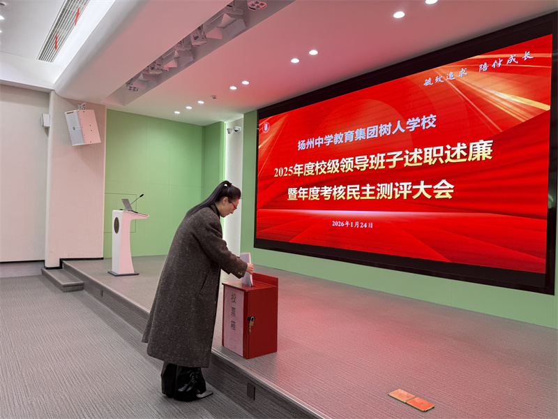 活动第一阶段,树人学校党委书记唐炜代表学校领导班子作年度述职述廉报告,南门街校区作分会场观看直播。唐书记围绕一年来学校在党建引领、教育教学改革、师资队伍建设、学生全面发展等方面取得的成效作了系统汇报。随后,与会教师对领导班子进行民主测评,过程规范有序,体现了学校管理的民主性与透明度。