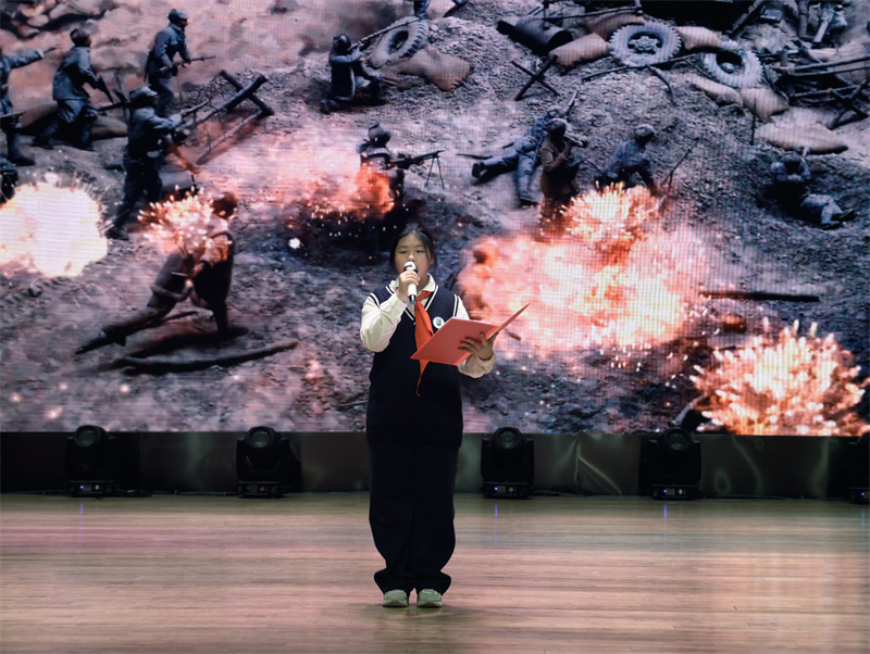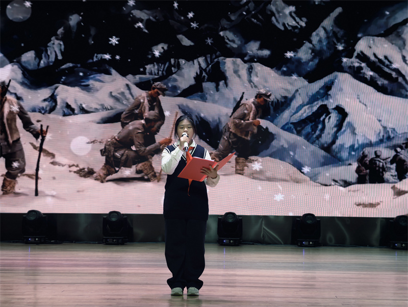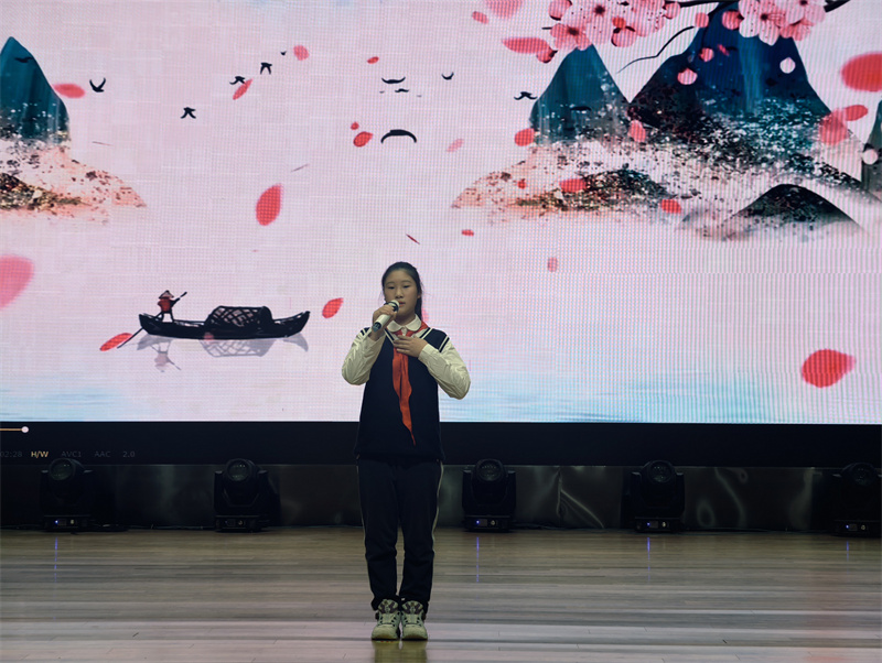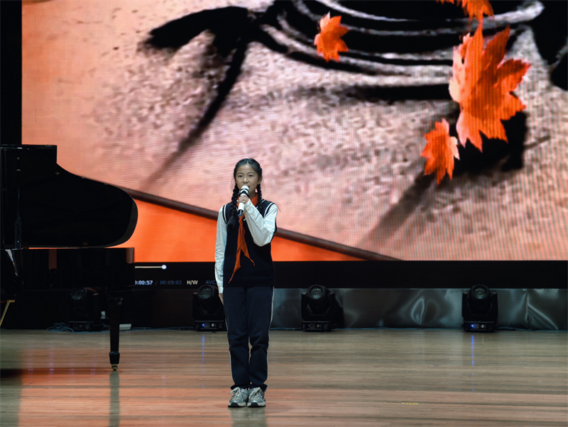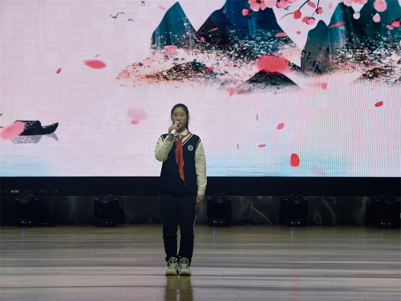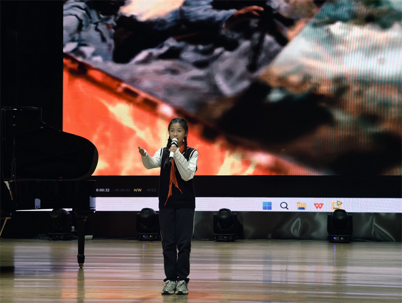 随后,初一(14)班汪昱辰再次演绎《不朽》,与开场的深情风格不同,她以激昂高亢的节奏、饱满炽热的情绪,诠释出不朽精神在新时代的传承与延续,展现出青少年赓续红色血脉的坚定决心,让在场观众对英雄的崇敬之情愈发浓烈,现场氛围持续升温。