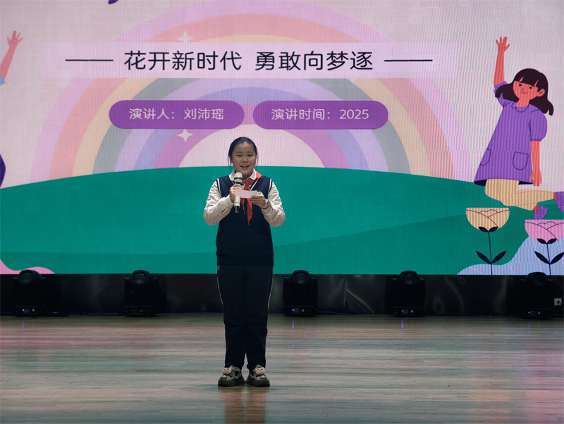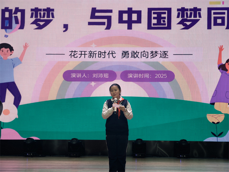 初一(15)班刘沛瑶带来的《我的梦 与中国梦同行》,则以沉稳厚重的风格打动了全场。她用低沉有力的语调,回溯革命年代的烽火岁月,讲述先烈们为家国大义挺身而出的英雄事迹,字字句句饱含敬意,让观众在肃穆的氛围中感悟英雄精神的不朽价值。