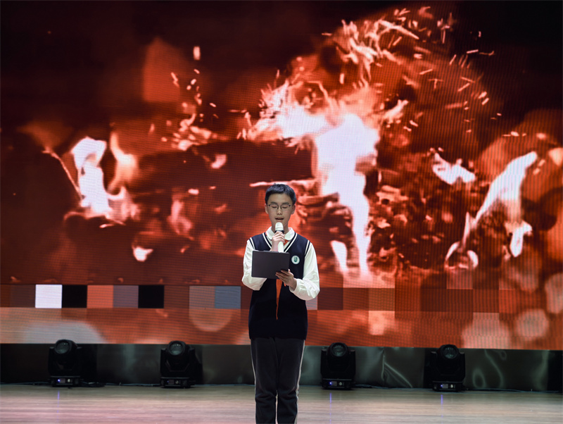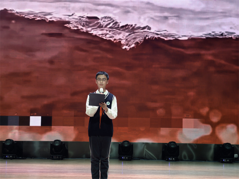 初二(16)班张森译的《永不消失的声音》则掀起了赛场的第一个小高潮。选手以铿锵有力的嗓音、富有感染力的演绎,再现了那些穿越岁月的时代强音,从先辈的呐喊到今人的奋进,每一句朗诵都凝聚着震撼人心的力量,传递出永不磨灭的信念,赢得台下阵阵掌声。
