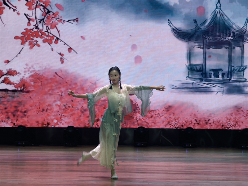 初一(4)班金玥汐同学随后献上古典舞《青松皓鹤》。其舞姿翩若惊鸿、婉若游龙,身形舒展中透出古典韵律的雅致与含蓄,以柔美而有力的肢体语言描绘出青松傲骨、皓鹤高洁的意境,令人沉浸于中国传统艺术的深远氛围中。