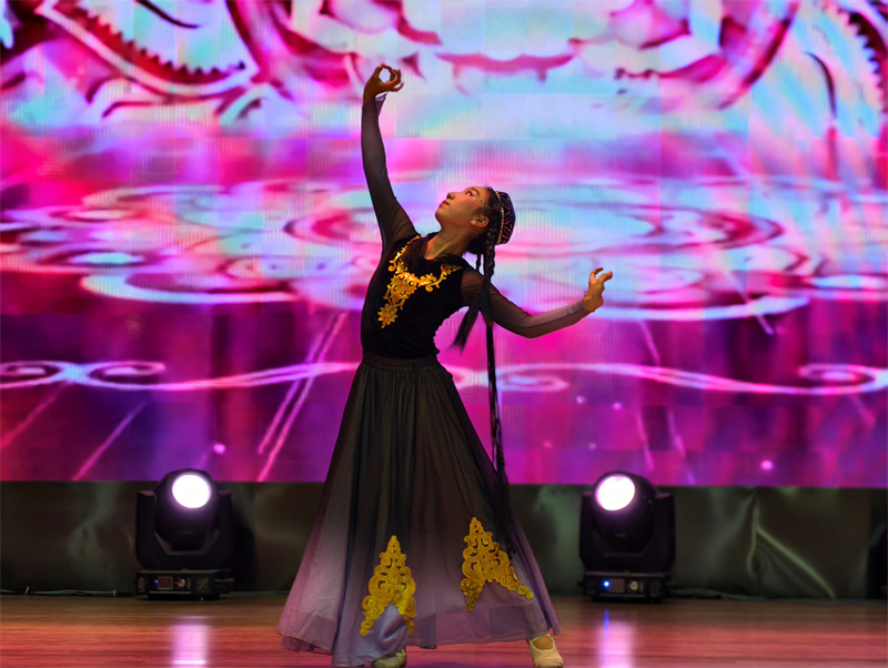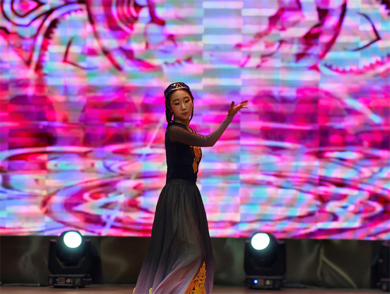 紧接着,初一(15)班陈沐菡同学带来了优美欢快的新疆舞《克孜古丽》。她身着民族服饰,舞步轻灵、眼神动人,手腕翻转间尽显维吾尔族舞蹈的独特韵味,仿佛将观众带到了辽阔美丽的新疆草原,赢得了阵阵掌声。