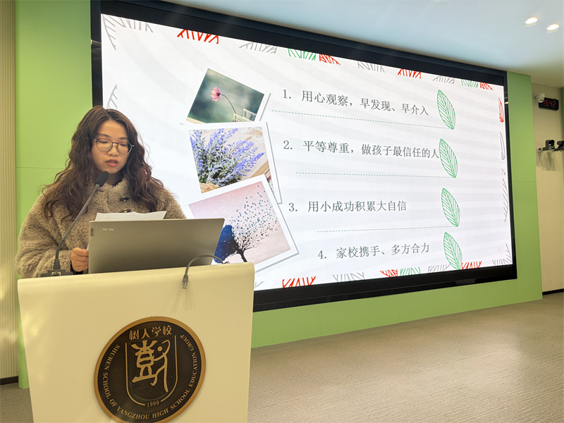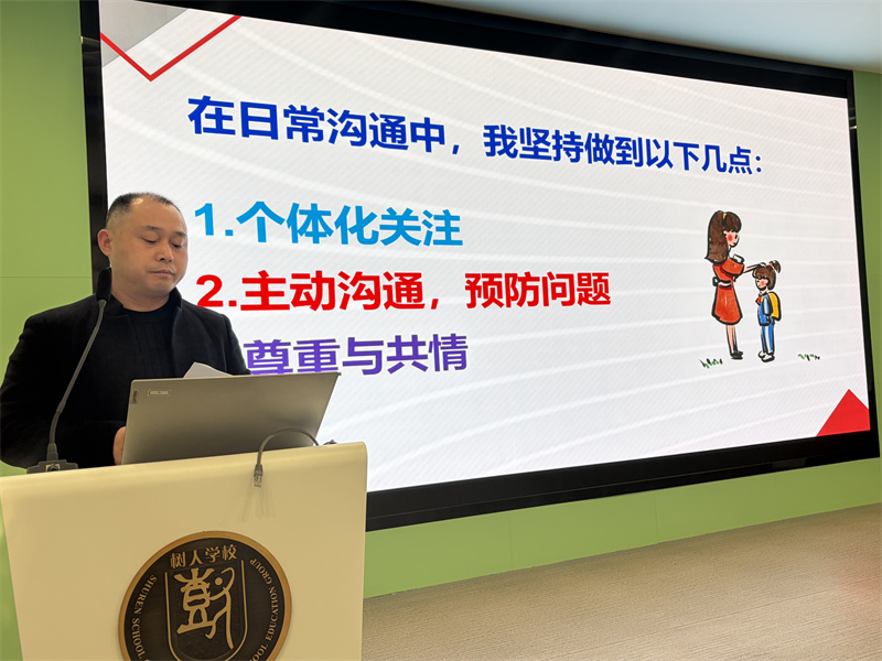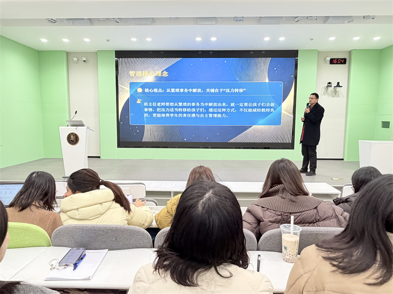 三位资深班主任结合带班实践,从不同维度分享育人经验,为全体班主任传经送宝。赵全老师以“家和万事兴”为主题,阐释了家校沟通技巧,强调以用心关爱为底色,个体化关注学生情况;规范班级群管理,保护隐私;批评学生坚持私下沟通、对事不对人,搭建家校信任桥梁。吴悦老师围绕心理问题学生关爱展开分享,提出重点关注家庭特殊学生的假期状态,开学后及时跟进;以真诚接纳建立信任,营造包容班级氛围,引导同伴互助;通过小目标、学习伙伴、活动展示等帮学生积累自信,联动家长、学科老师、心理组形成多方关爱机制,用陪伴守护学生心灵。夏珠琳老师以“做智慧班主任,凝奋进少年心”为主题,分享“放权、同频、暖心、助攻”班级凝聚力建设策略,放权培养学生自主管理能力,共定目标让个人与班级同频共振,以暖心举措缓解学生压力,携手科任老师形成育人合力,打造团结奋进的班集体。