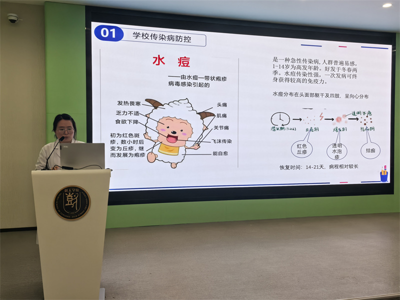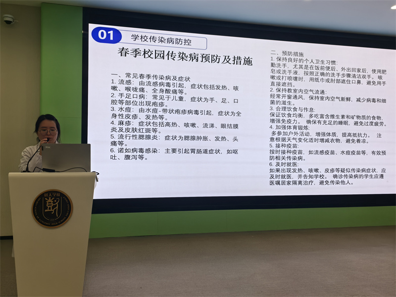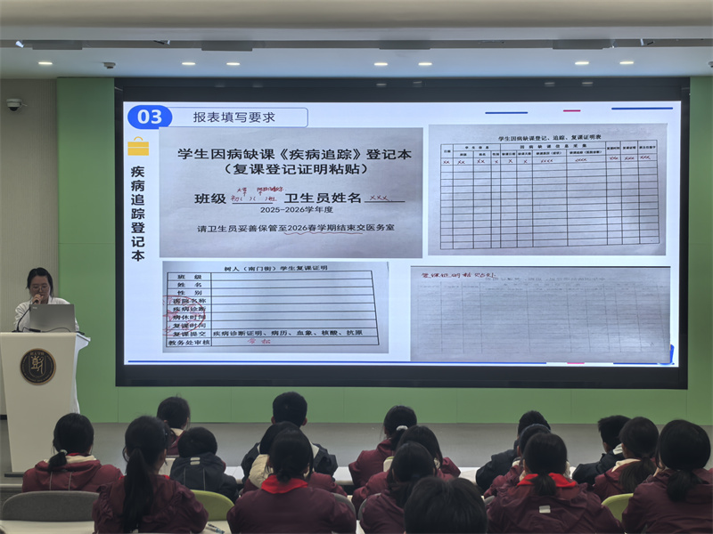 培训会上,校医季婷详细交代了班级卫生员的职责,重点讲解了因病缺课日报表、学生在校体温一日三测周表、学生因病缺课登记追踪复课证明表以及学生复课证明的填写方法,强调了正确填写上报。对于及时掌握学生健康状况、防止疾病传播的重要意义。详细讲解了春季传染病预防措施,期中重点指出患上水痘后处置方案与复课要求。