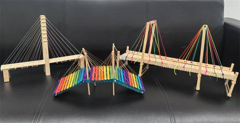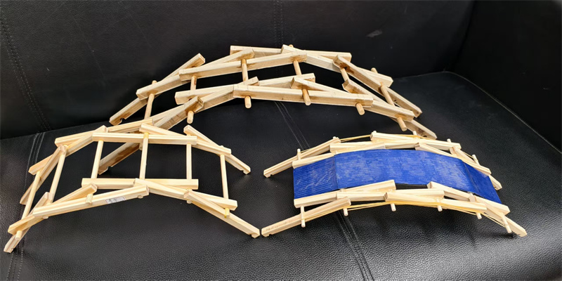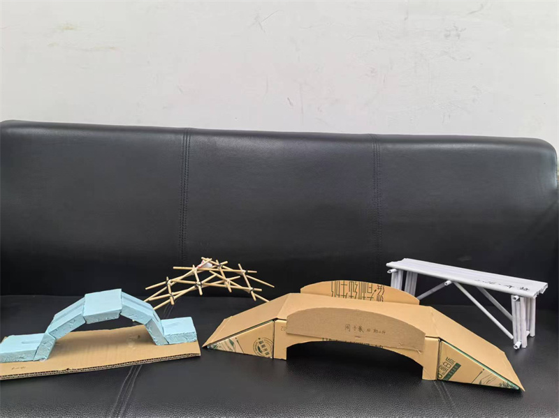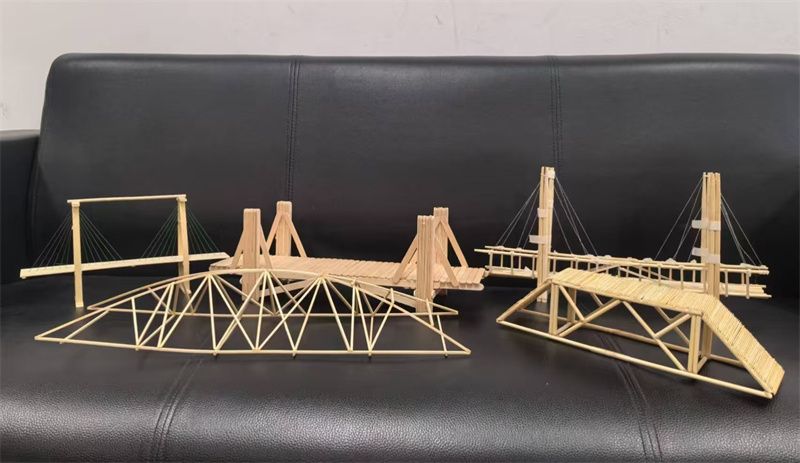 桥梁调查与模型制作活动中,同学们先查阅资料、实地观察,了解梁桥、拱桥、斜拉桥等不同桥梁的结构特点与力学原理。随后利用竹签、纸板、吸管、冰棒棍等材料,精心搭建桥梁模型。许多作品结构稳固、造型美观,充分体现了三角形稳定性、受力均衡等物理知识在工程中的应用,展现了扎实的物理功底与工程思维。。