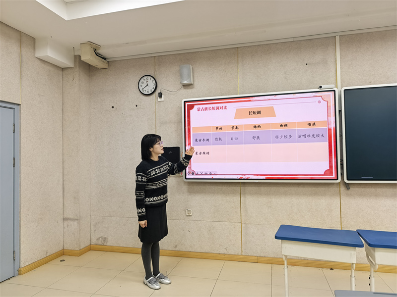 结合马年春晚,公开课聚焦蒙古族音乐文化,欣赏经典民歌。周老师引导学生辨析长调与短调的核心差异,包括悠远自由与明快节奏的特点,并结合地域文化讲解节拍规律与创作背景,通过现场听辨、哼唱等互动提升音乐感知力。