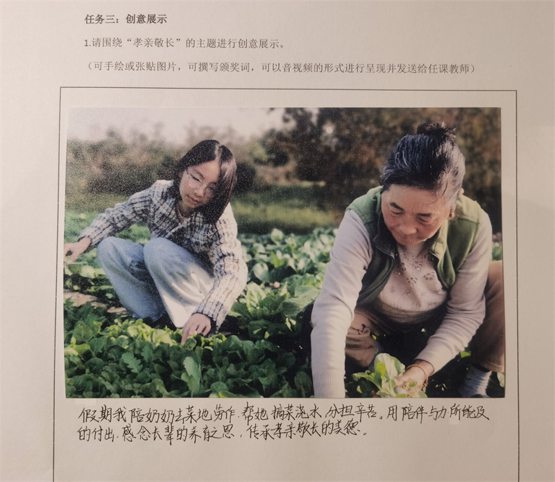 结合七年级下册“我的语文生活”“孝亲敬老,传承家风”等专题学习活动,设计了“招牌中的语文”“对联里的中国”“小行大孝”“孝道与家风”四项实践作业。鼓励学生在日常生活中发现语文、运用语文,让语文学习从课堂延伸到社会、家庭,真正实现“生活即语文”的教育理念。