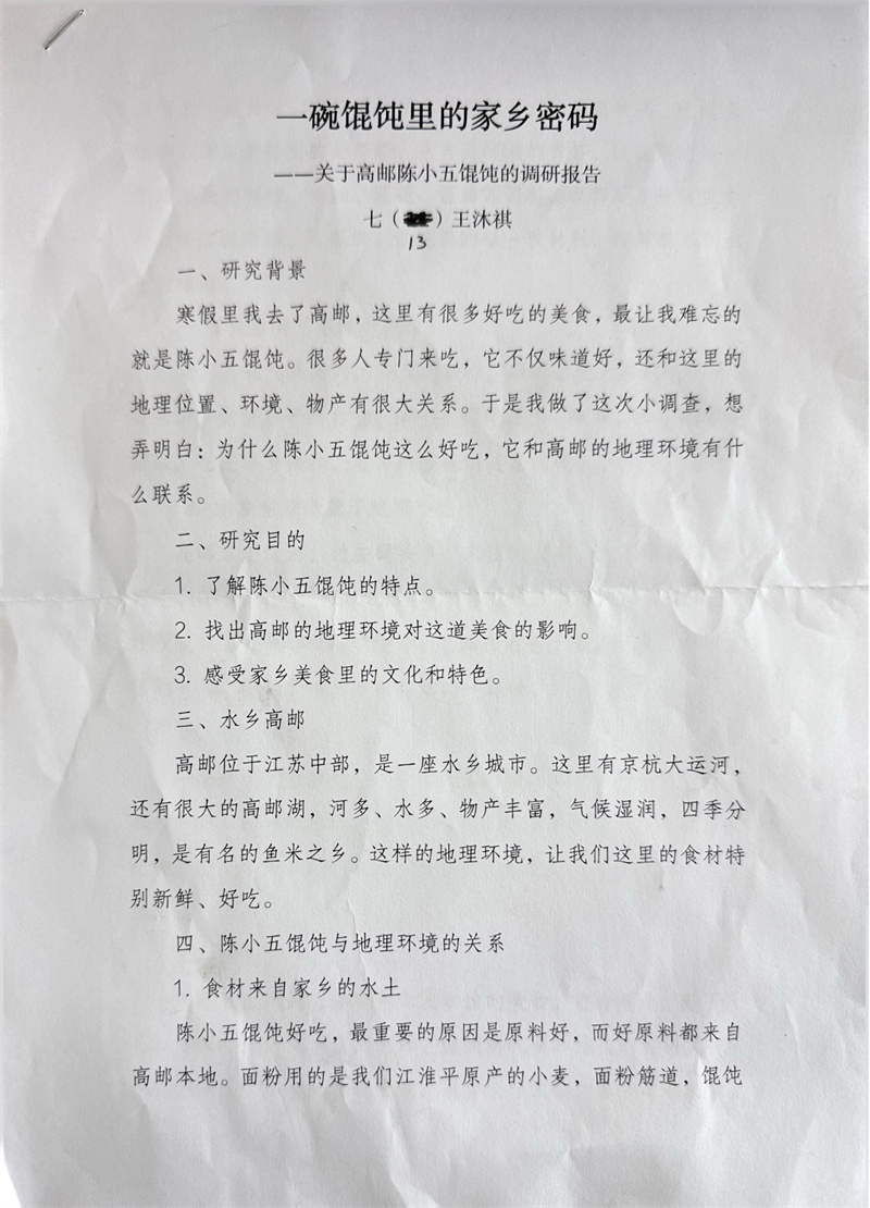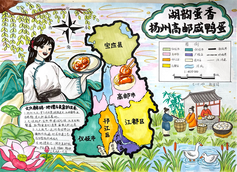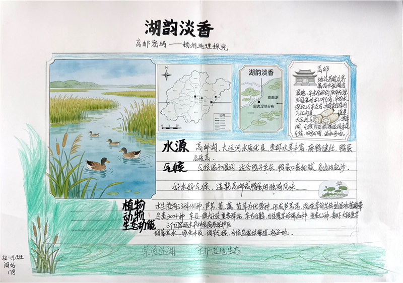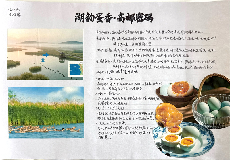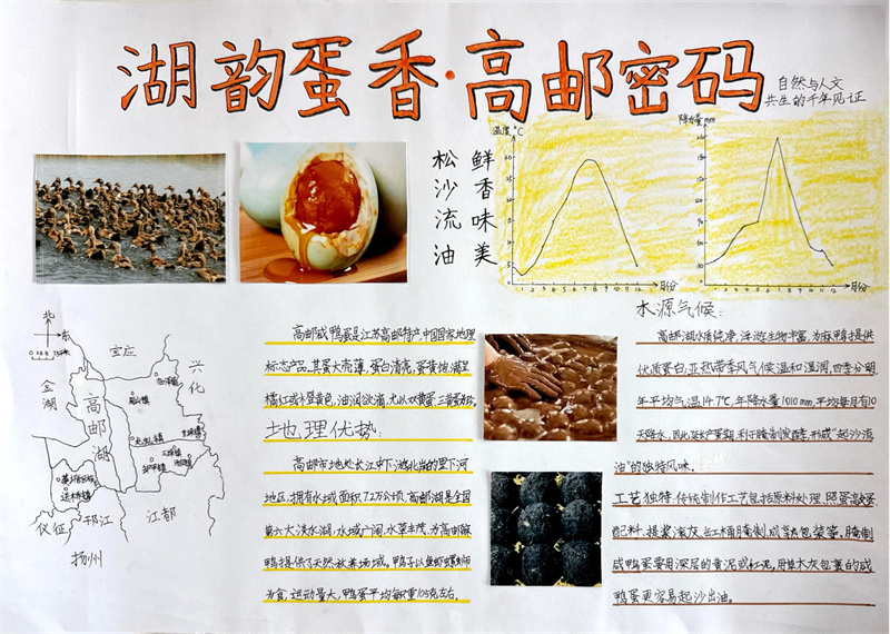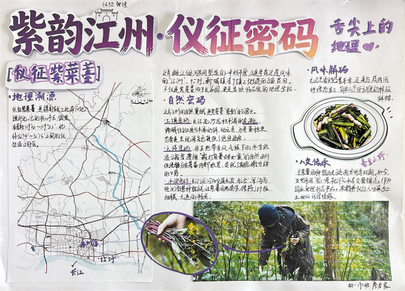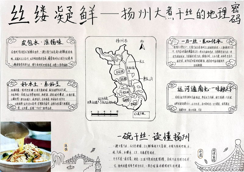 寒假期间,同学们积极响应,投入了一场别开生面的“地理大发现”。他们不仅查阅大量文献资料,剖析淮扬菜“就地取材,清淡平和”特点背后所依托的亚热带季风气候、平坦的地形以及河网密布等地理因素。还有很多同学走进厨房、走进农田、探索户外,亲手采摘制作并记录了一道道淮扬佳肴背后的地理故事。